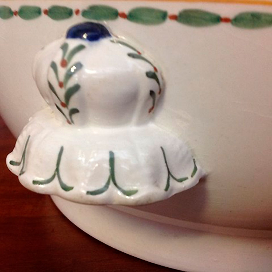 i Viol Stellet er i fajance og rund med låg. Låget og skålens kant