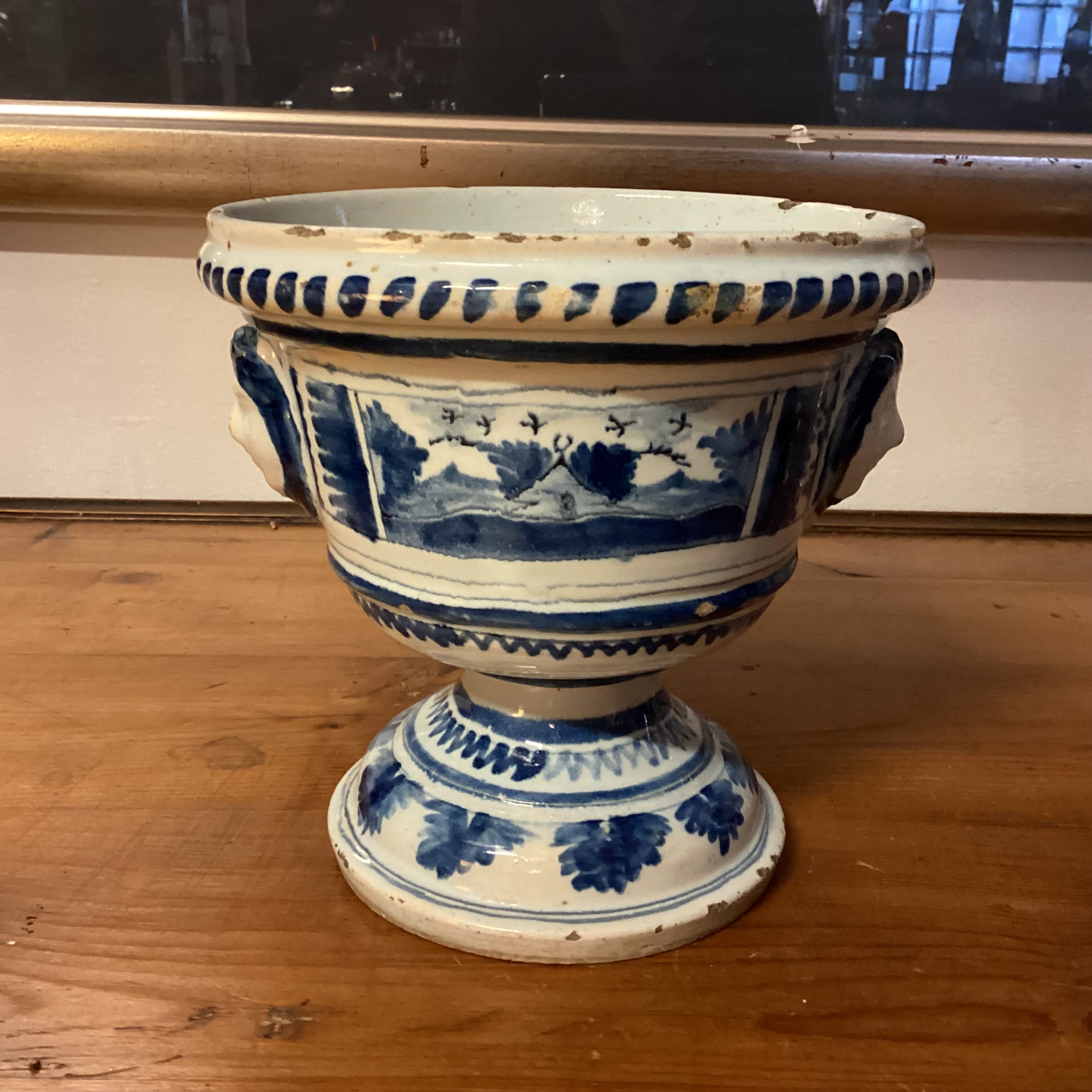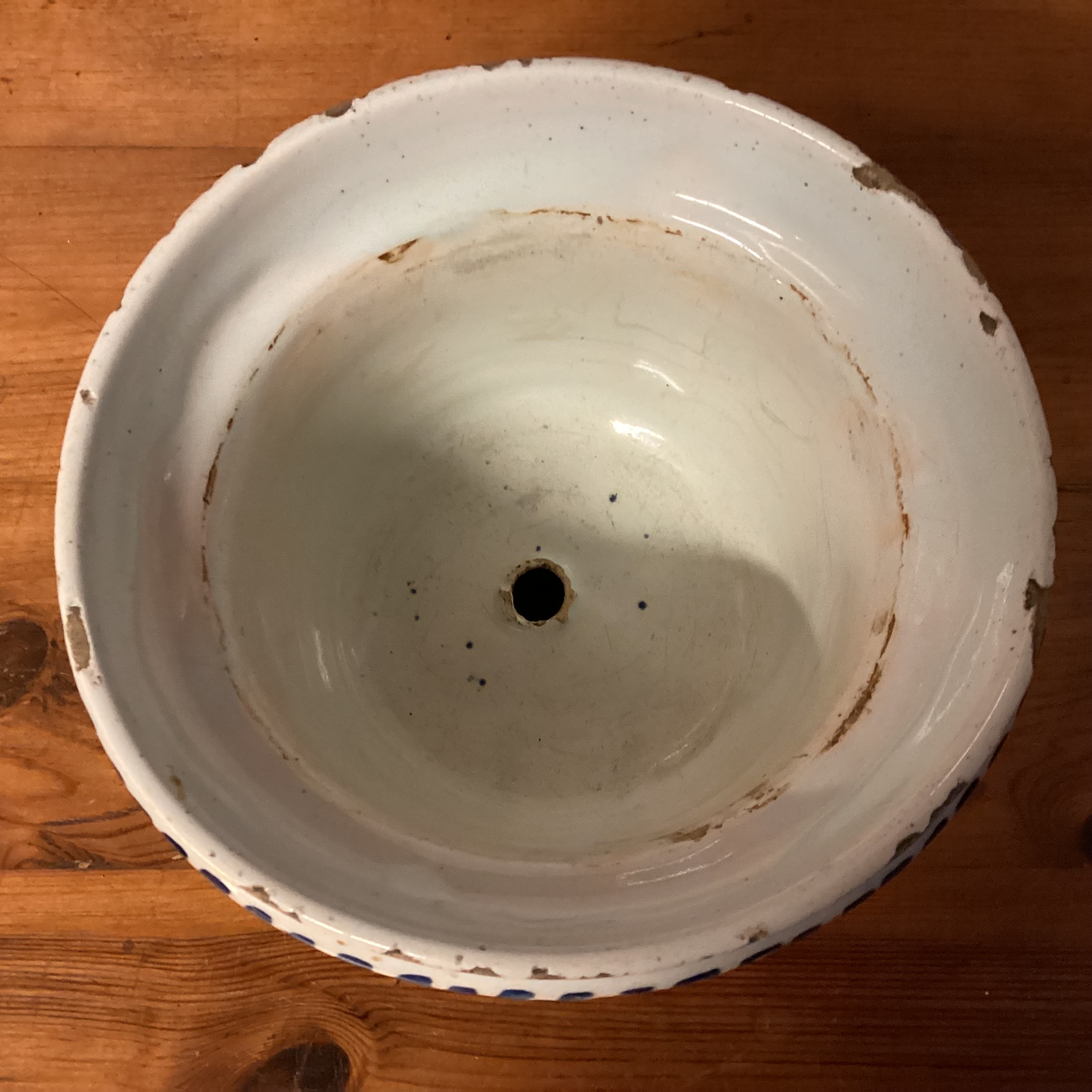 Antik Delf Blomsteropsats med blå dekoration. Rund antik Delf