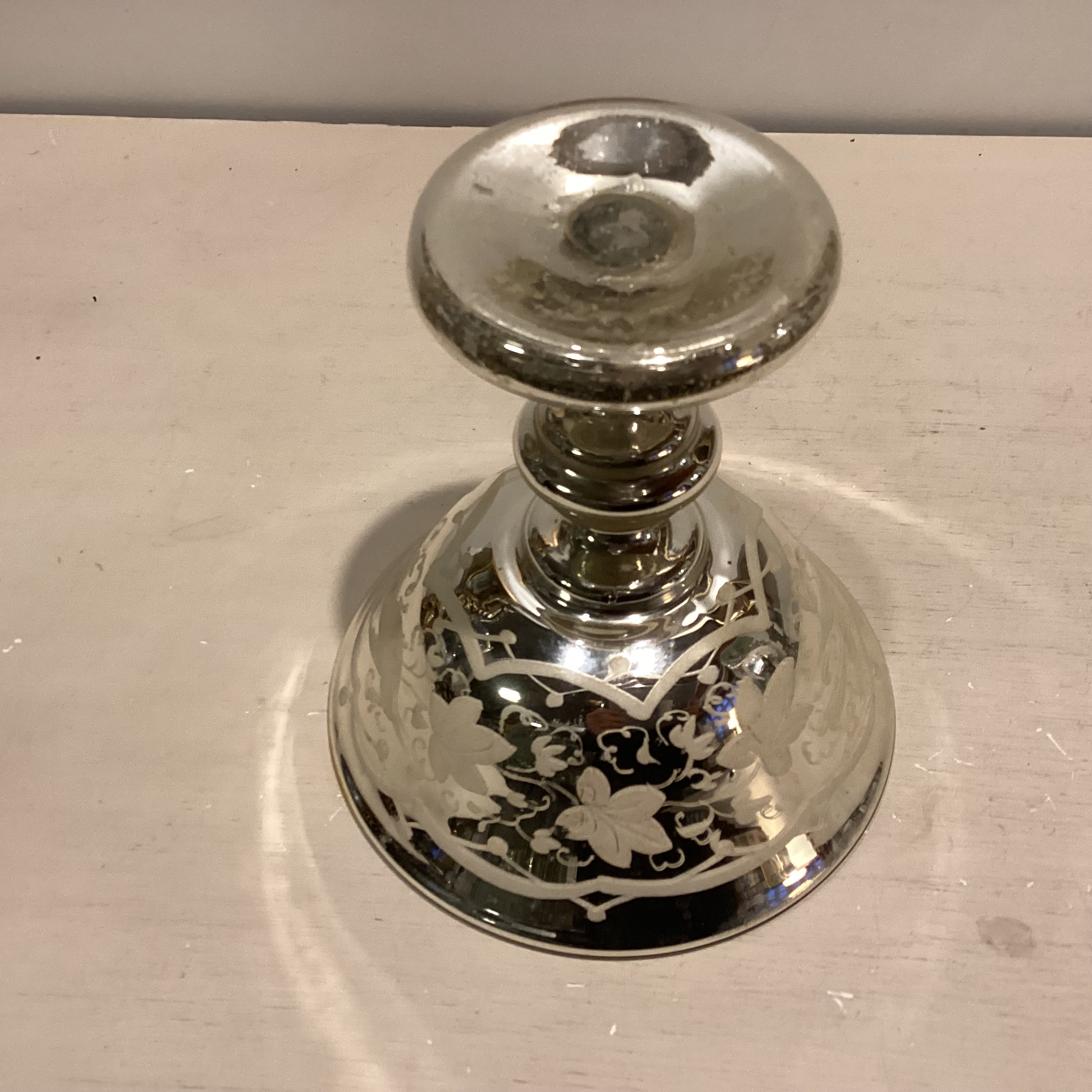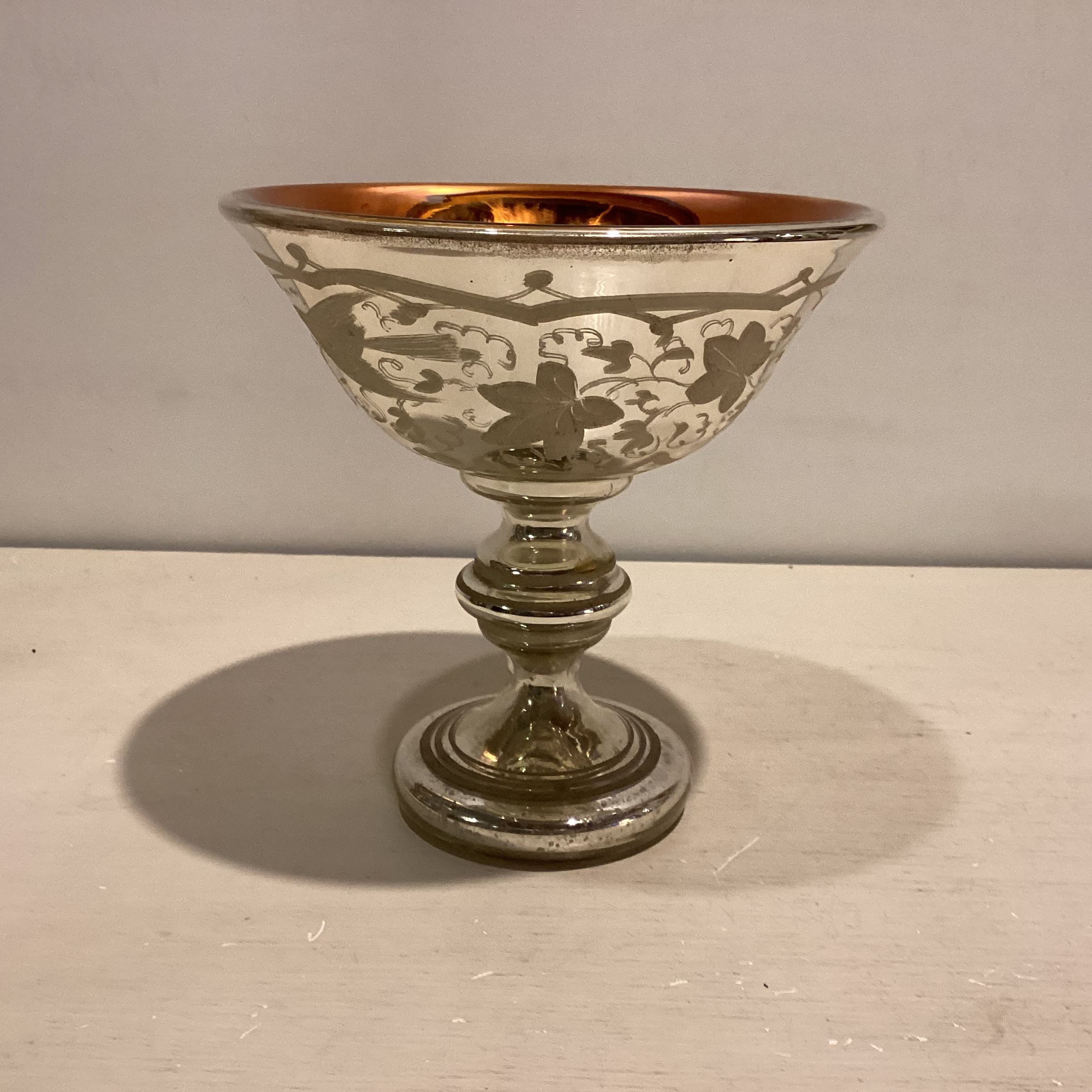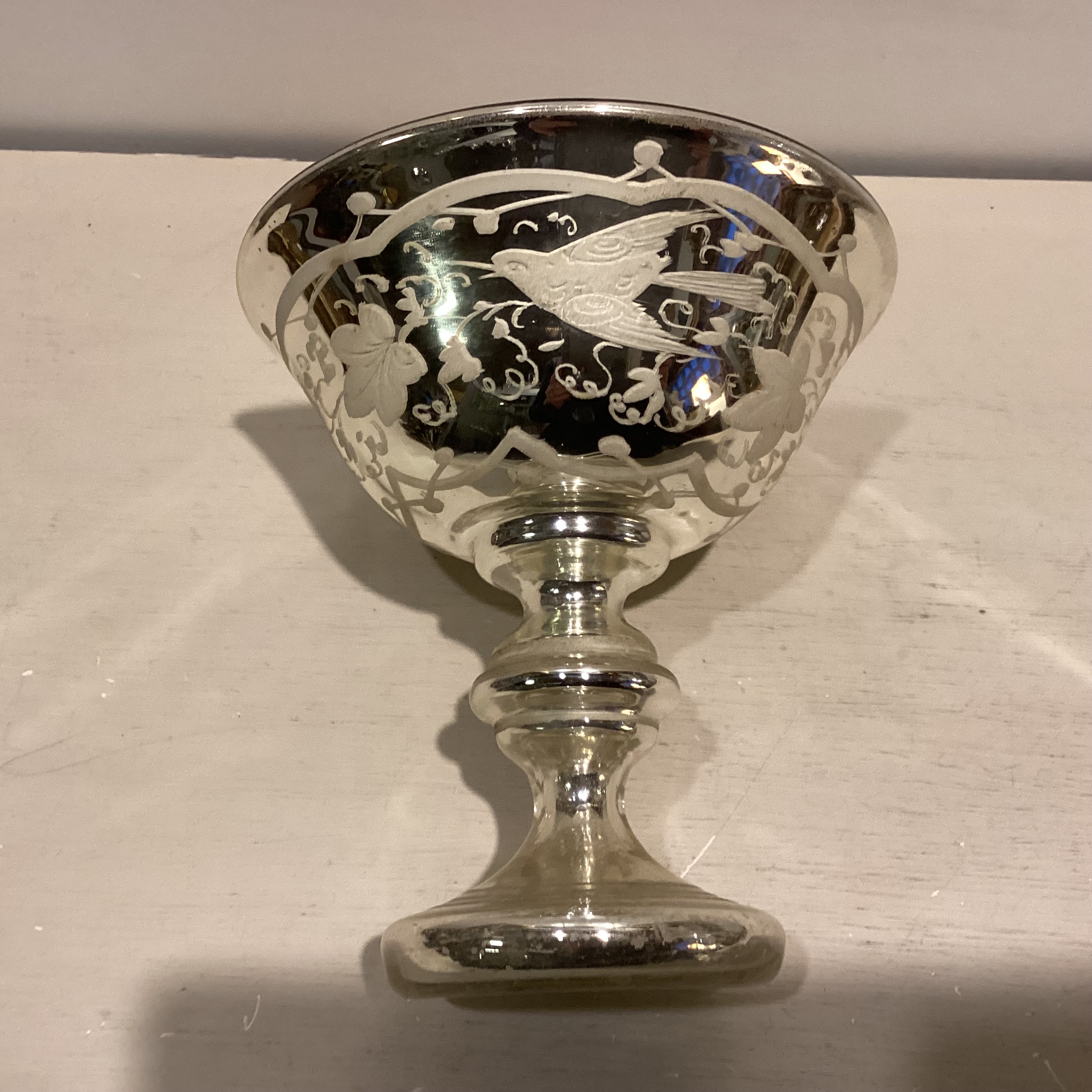 kviksølvsbelægning. Ydersiden er smukt prydet med hvide fugle og blade,