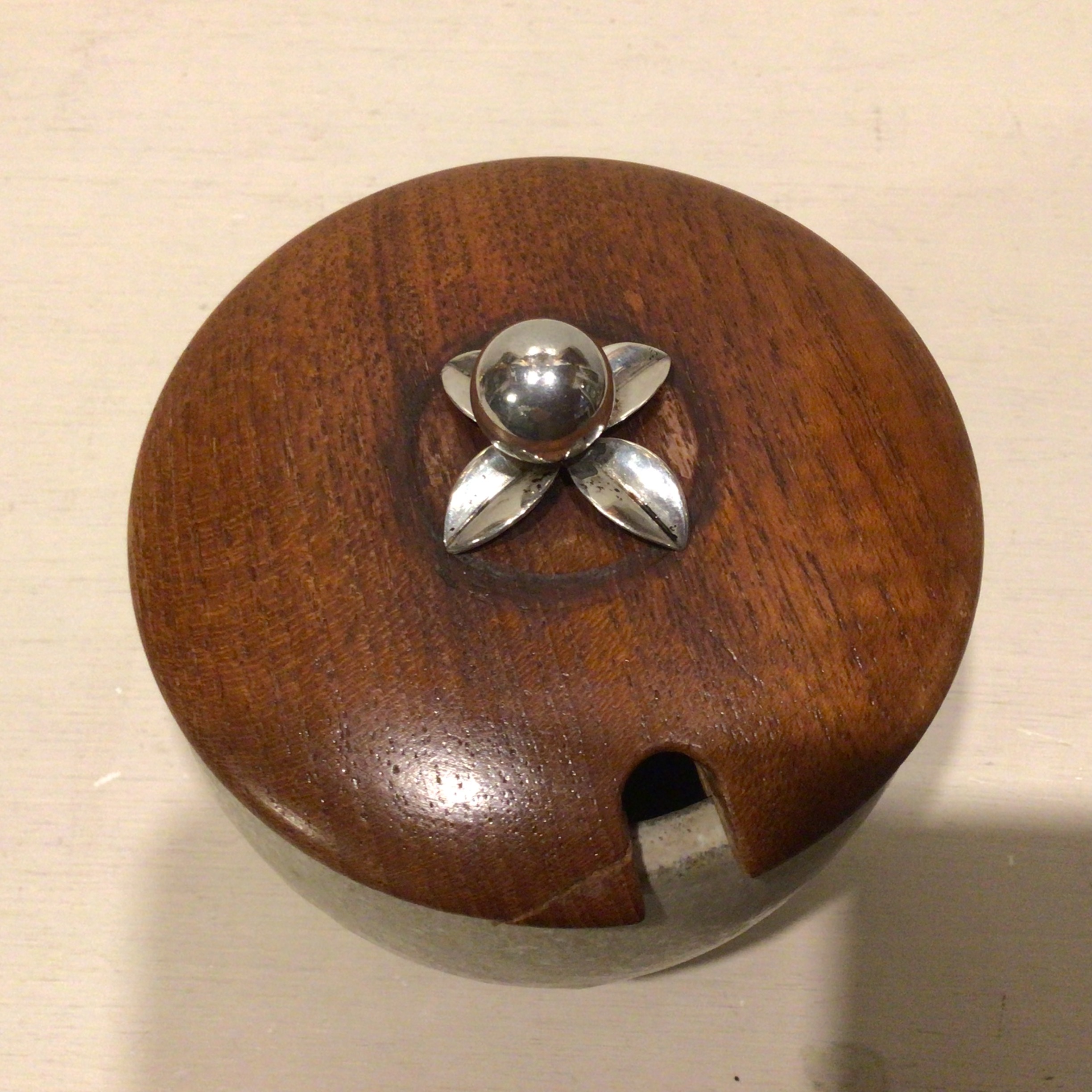 låg af træ med sølvblomst i top. Lille skade på låg se foto!
