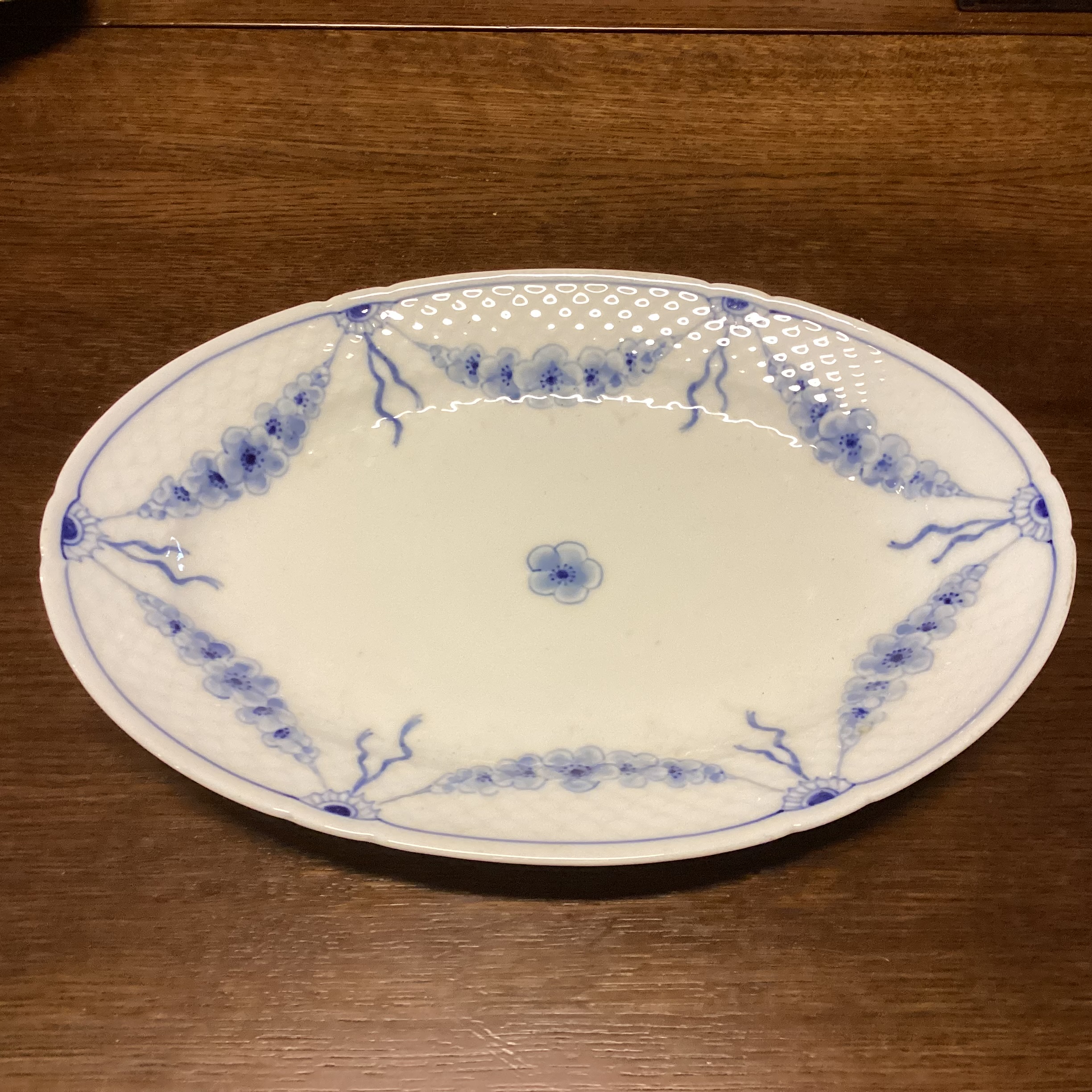 porcelæn hvid bundfarve med blå ranker og sløjfer. 2. sortering.
