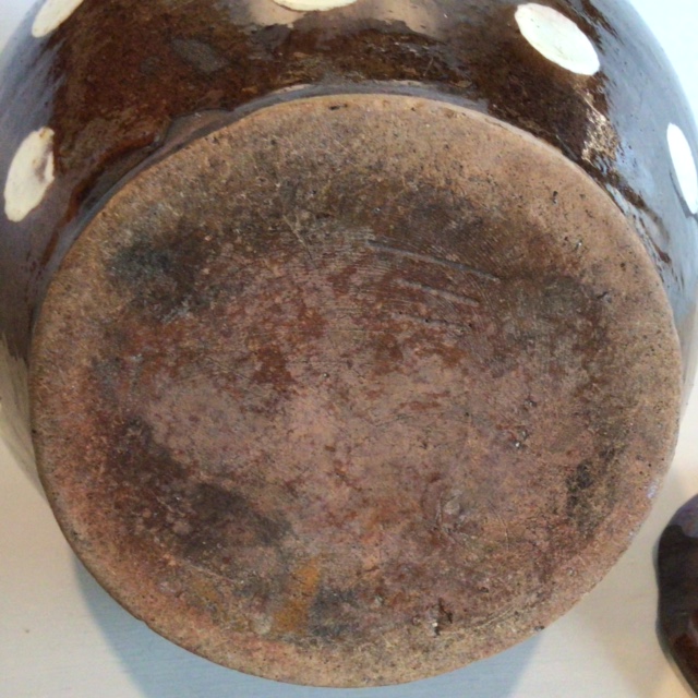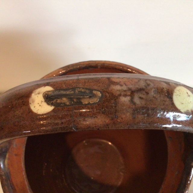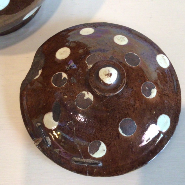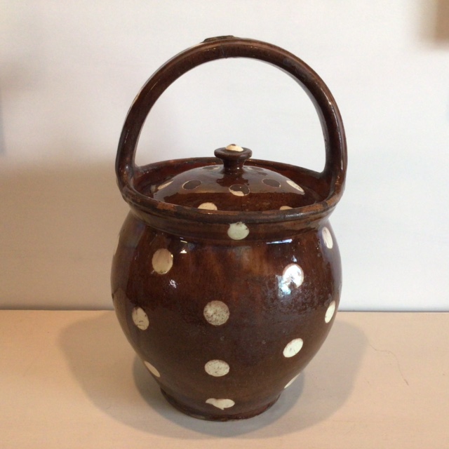 Dekorativ gammel Barselspotte brunglaseret med hvide bomber. Skønne gamle