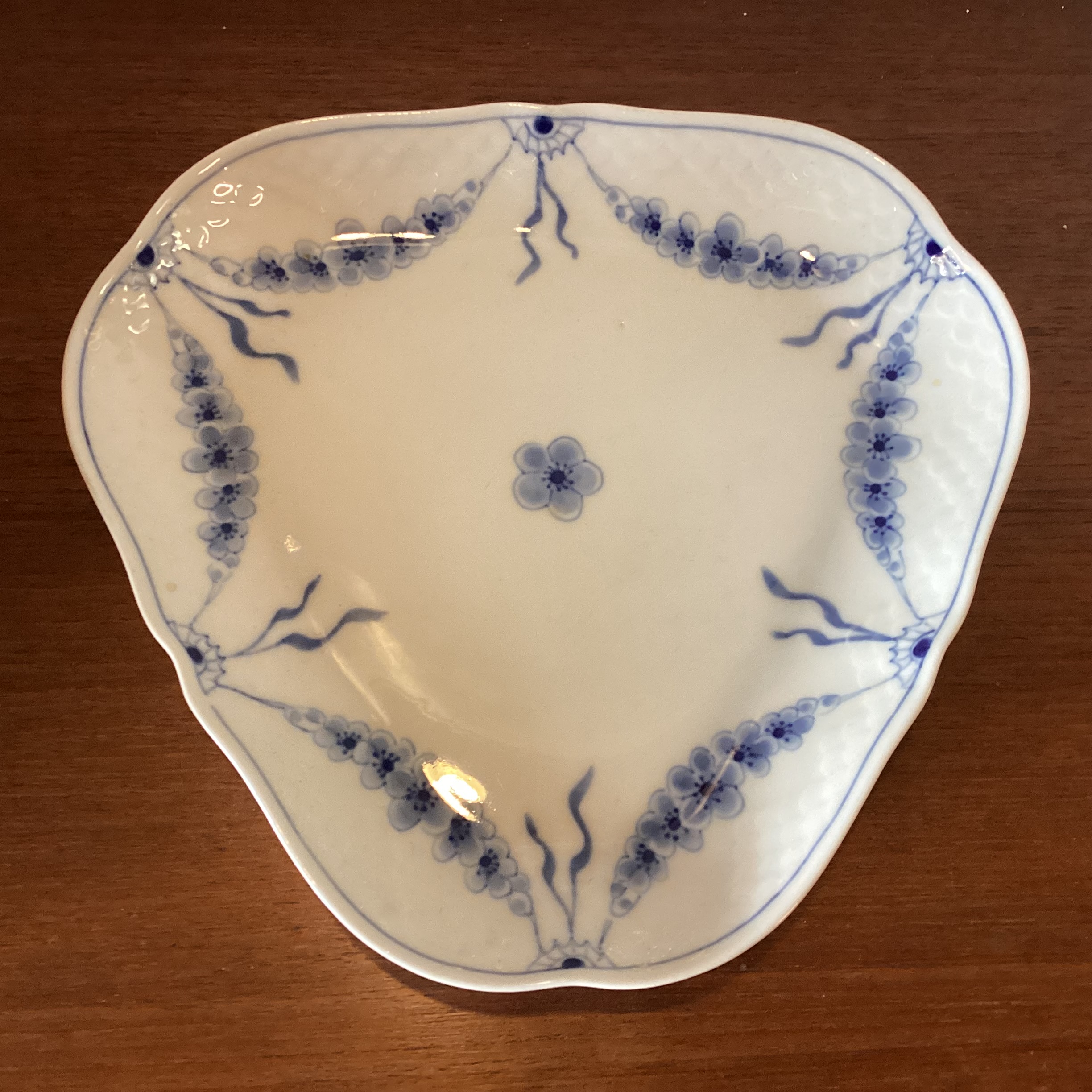 trekantfad #40 i håndmalet porcelæn. Fadet er 2. sortering og i fin brugt stand.