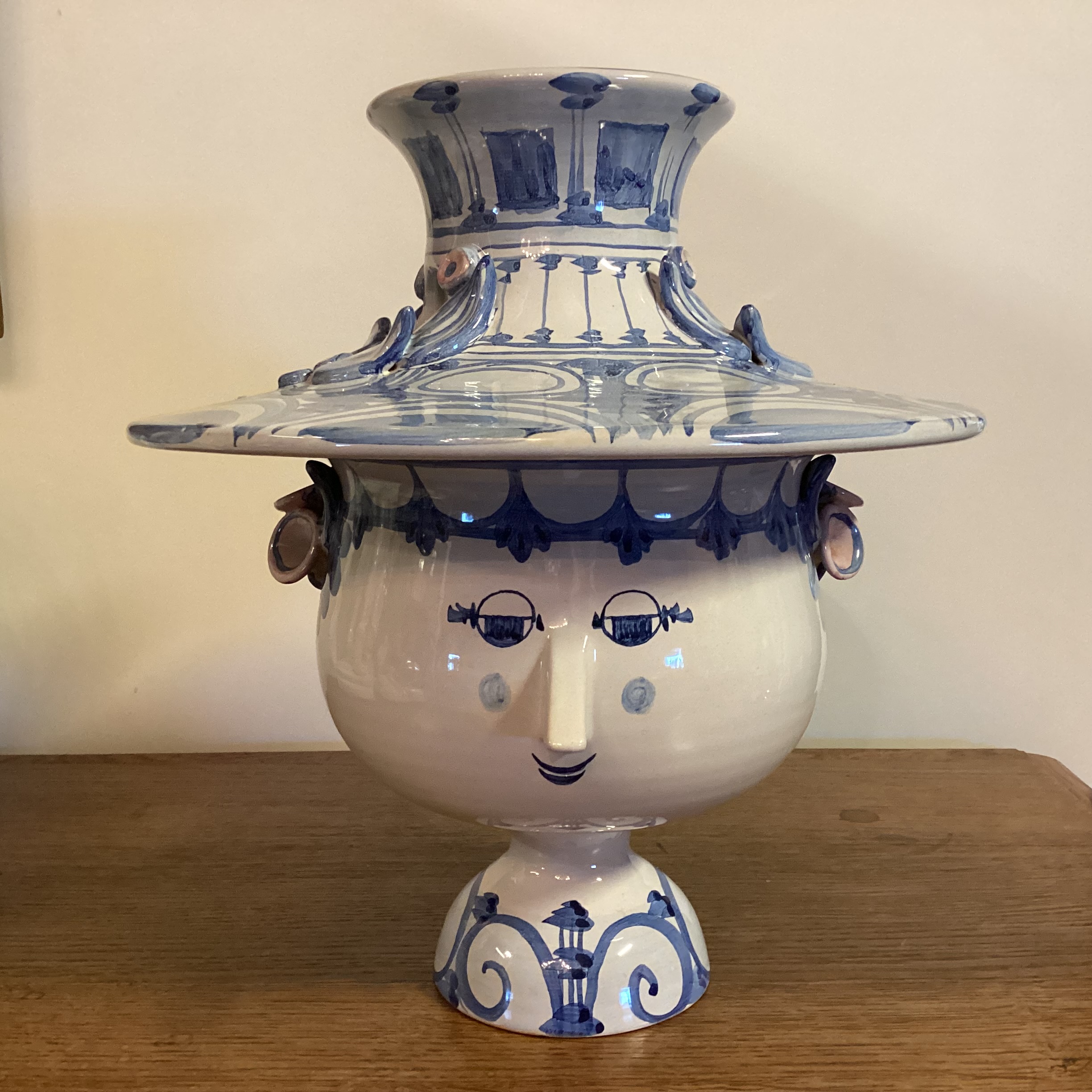 Lågvasen er formet som et kvinde hoved med en stor bredskygget