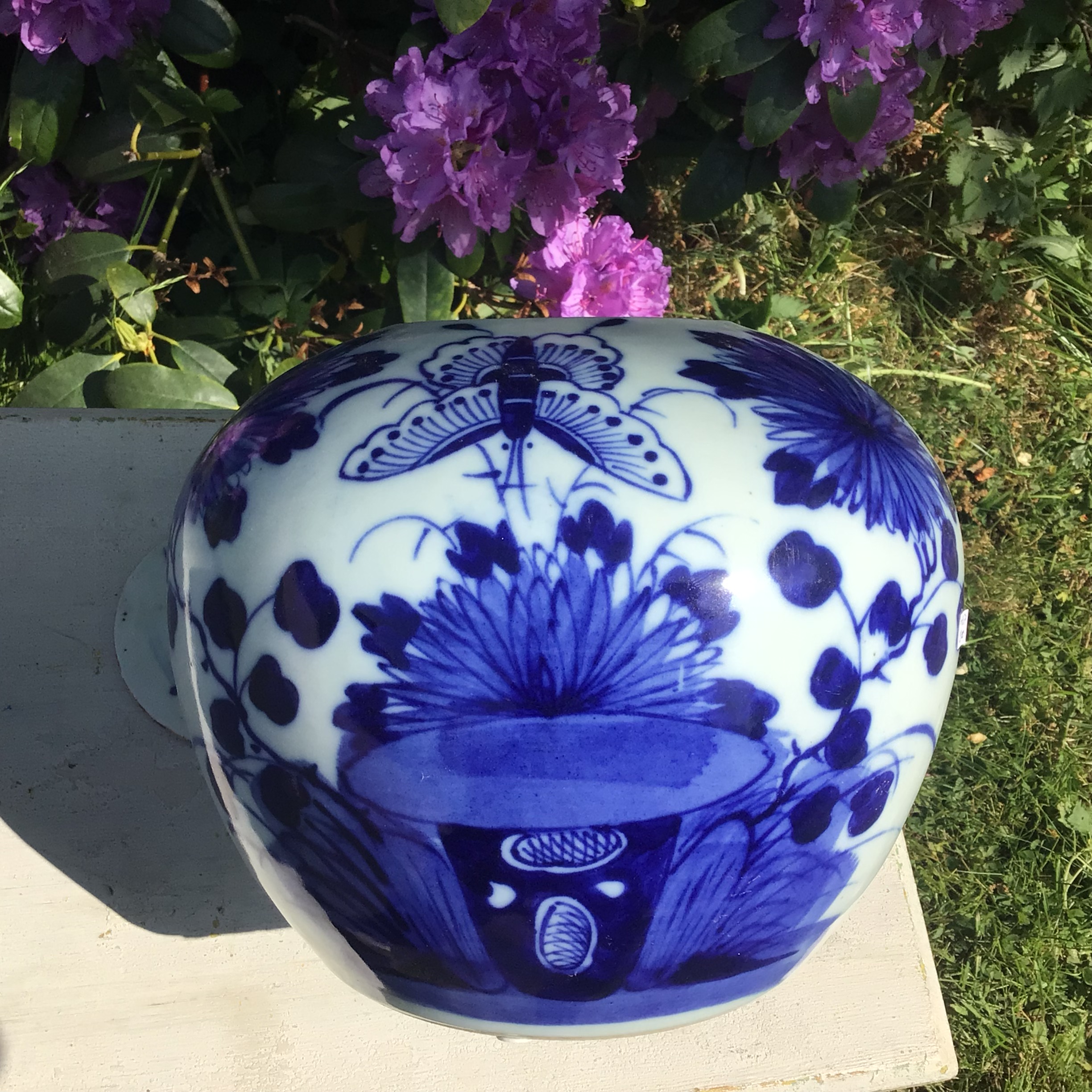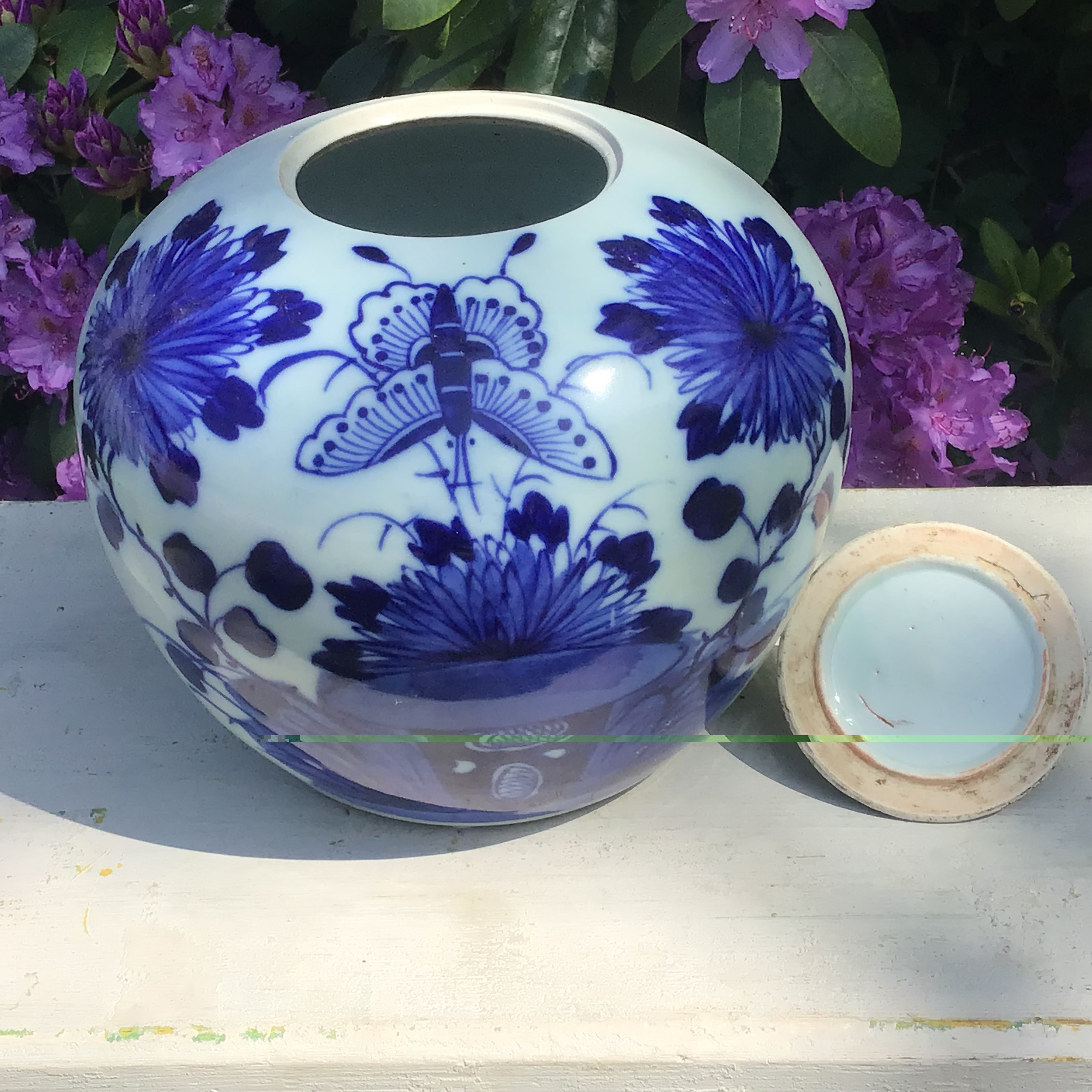 tilhørende låg er i porcelæn dekoreret med sommerfugl og