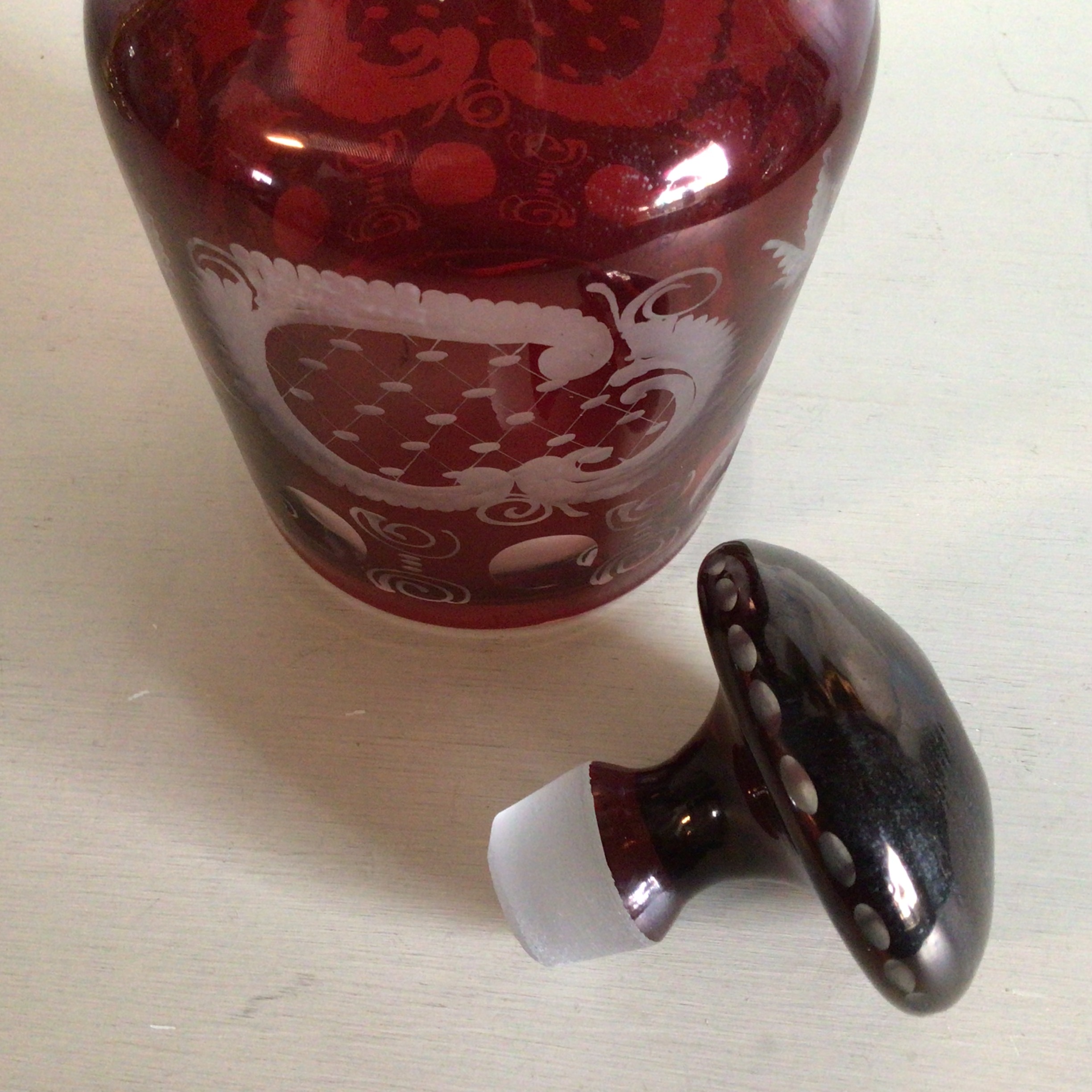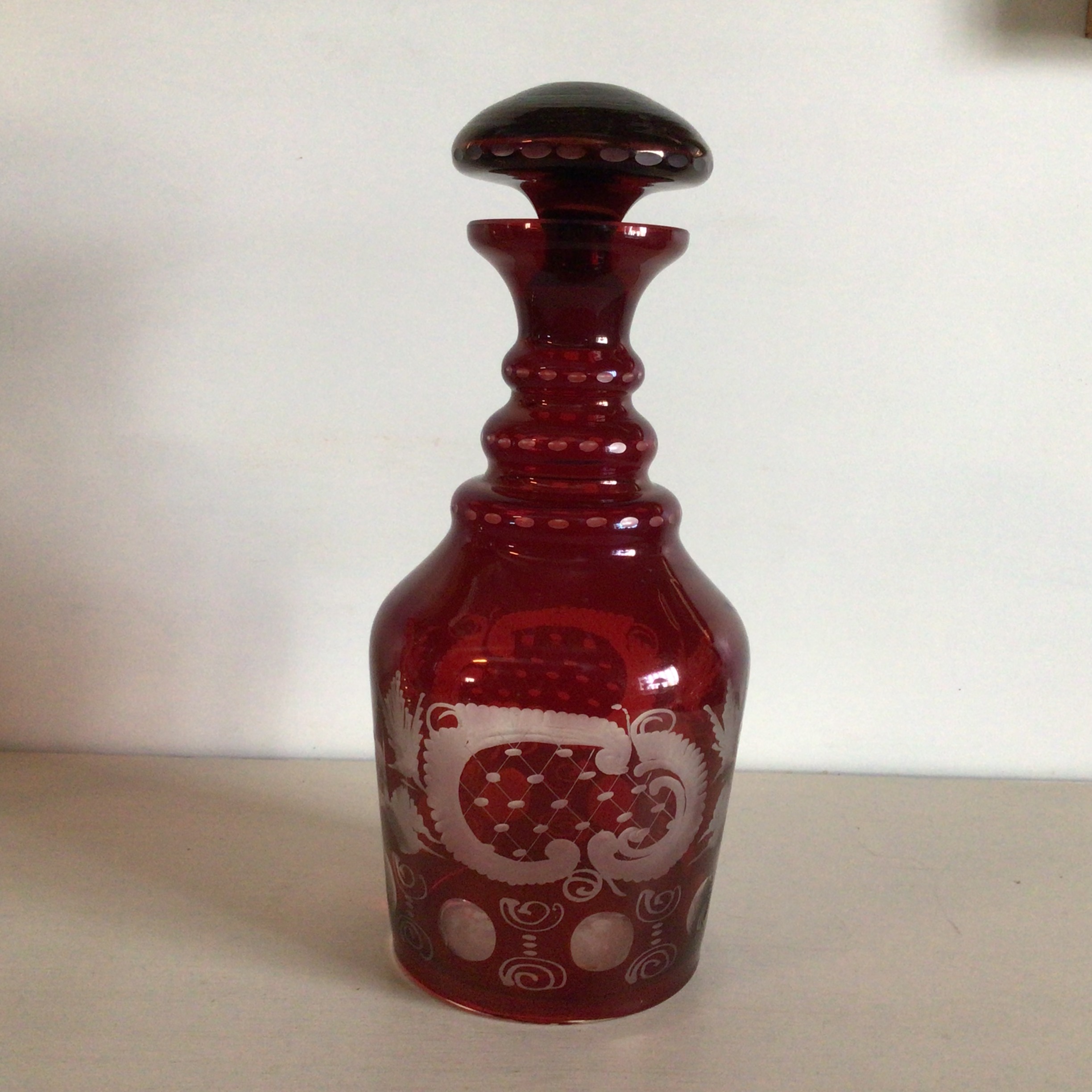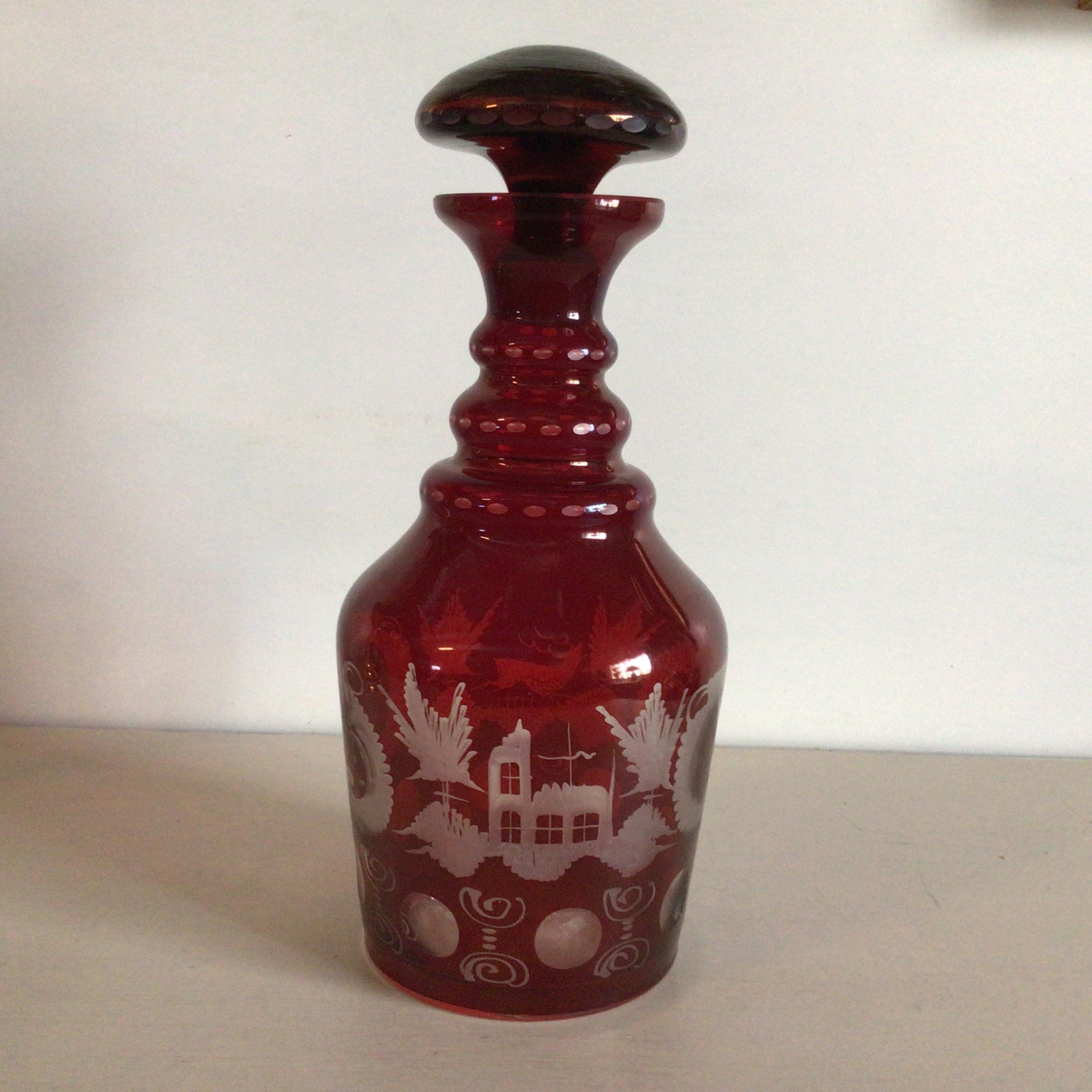 Stor flot Bøhmisk karaffel i rubinrød farve dekoreret med