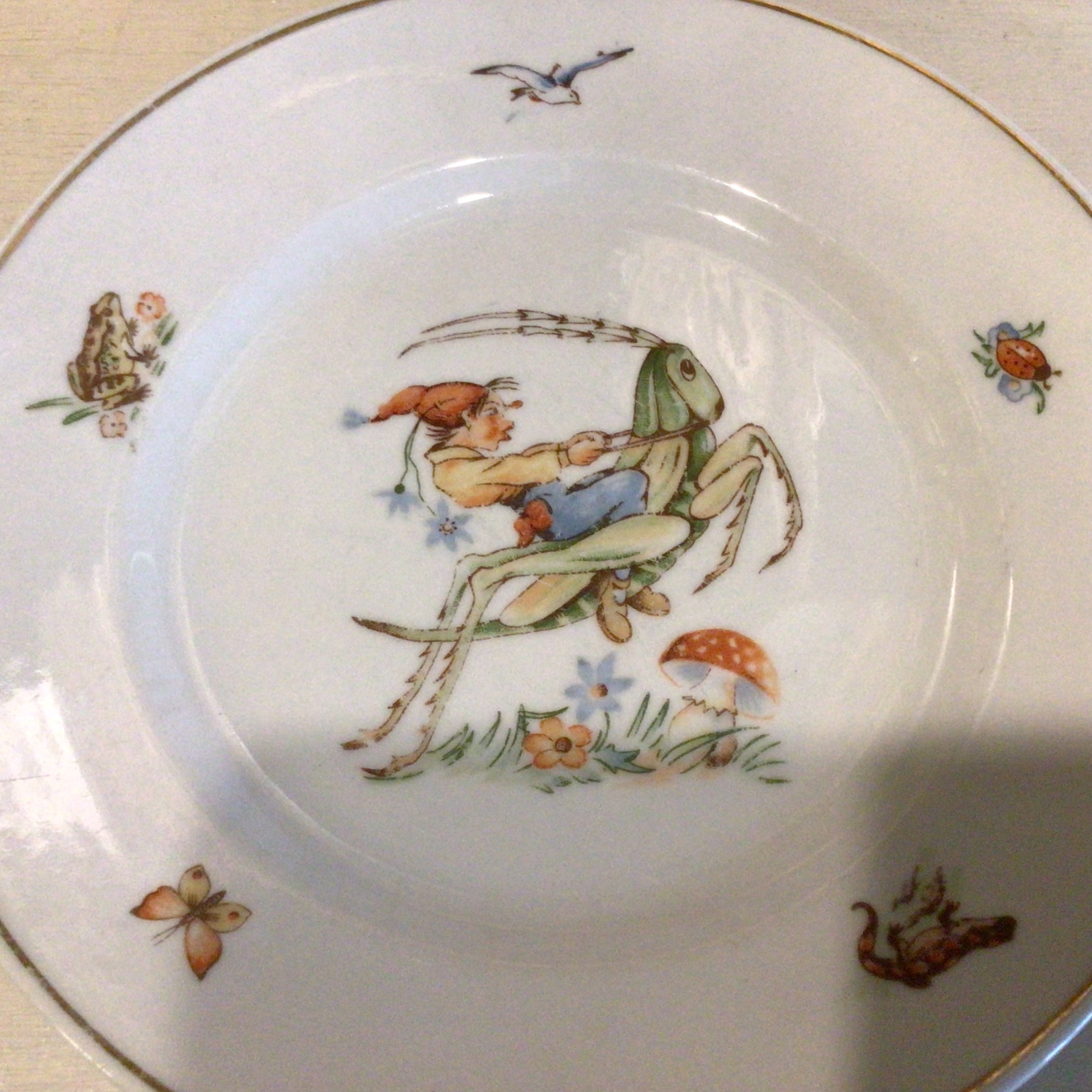 er i porcelæn og dekoreret med blomster, paddehat, frø, måge, mariehøne,