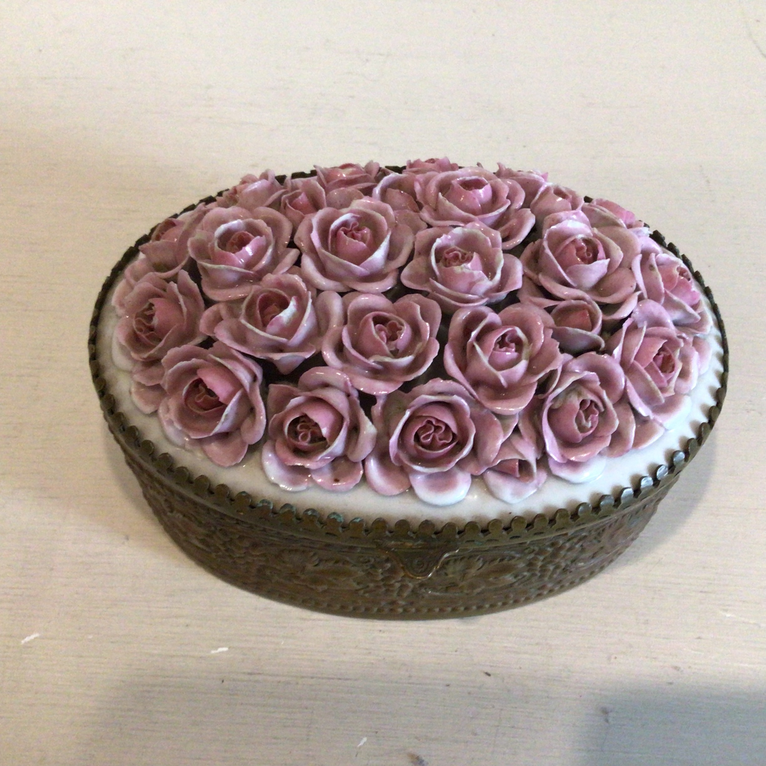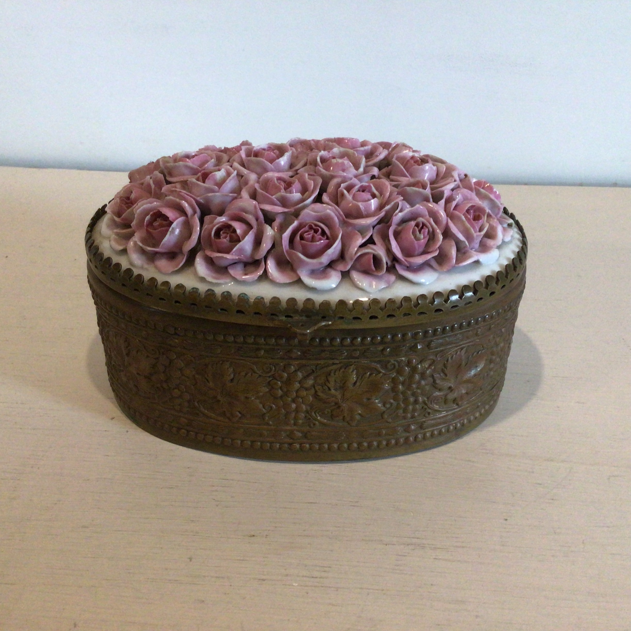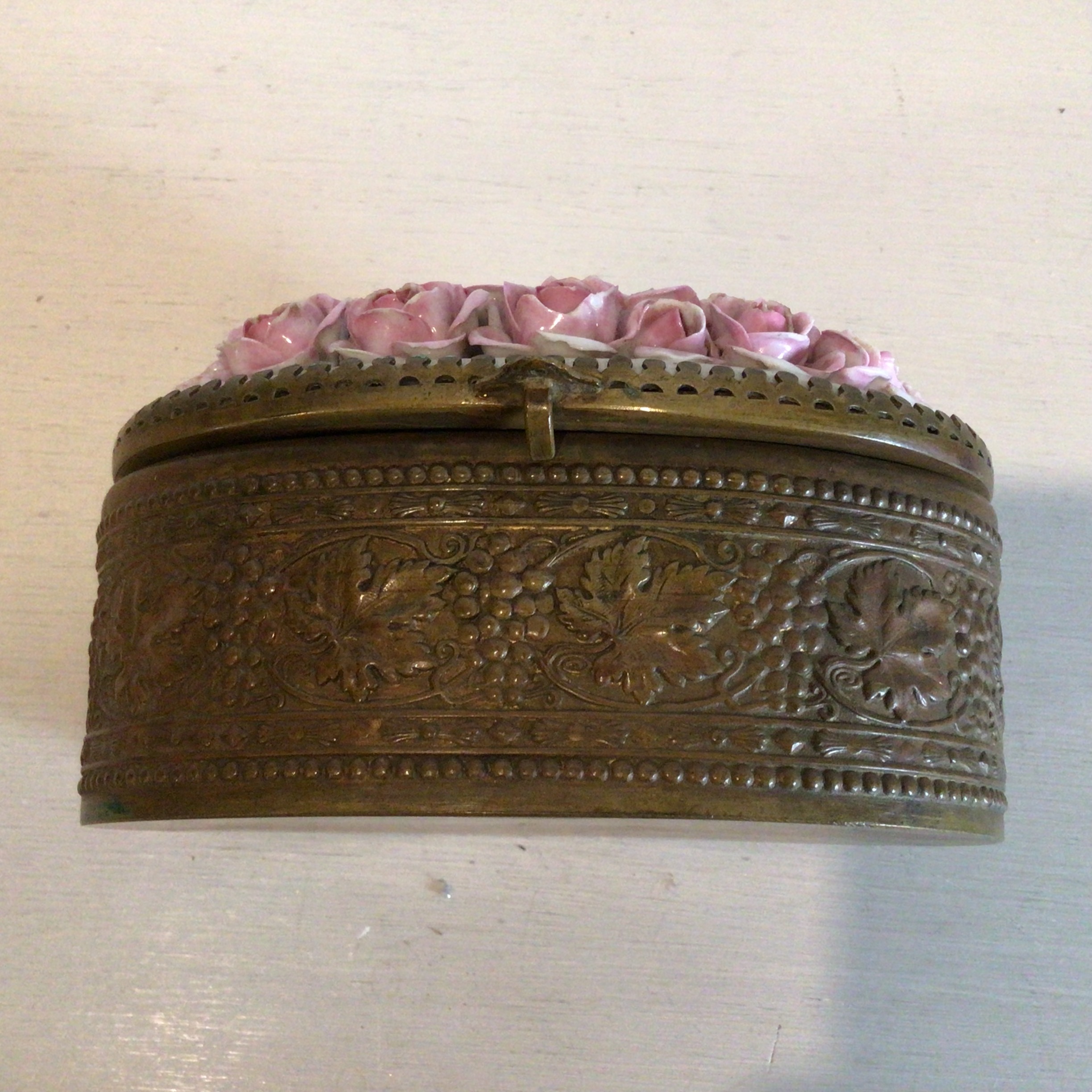 Bonbonniere med pouserende roser og bronce montering. Den smukke