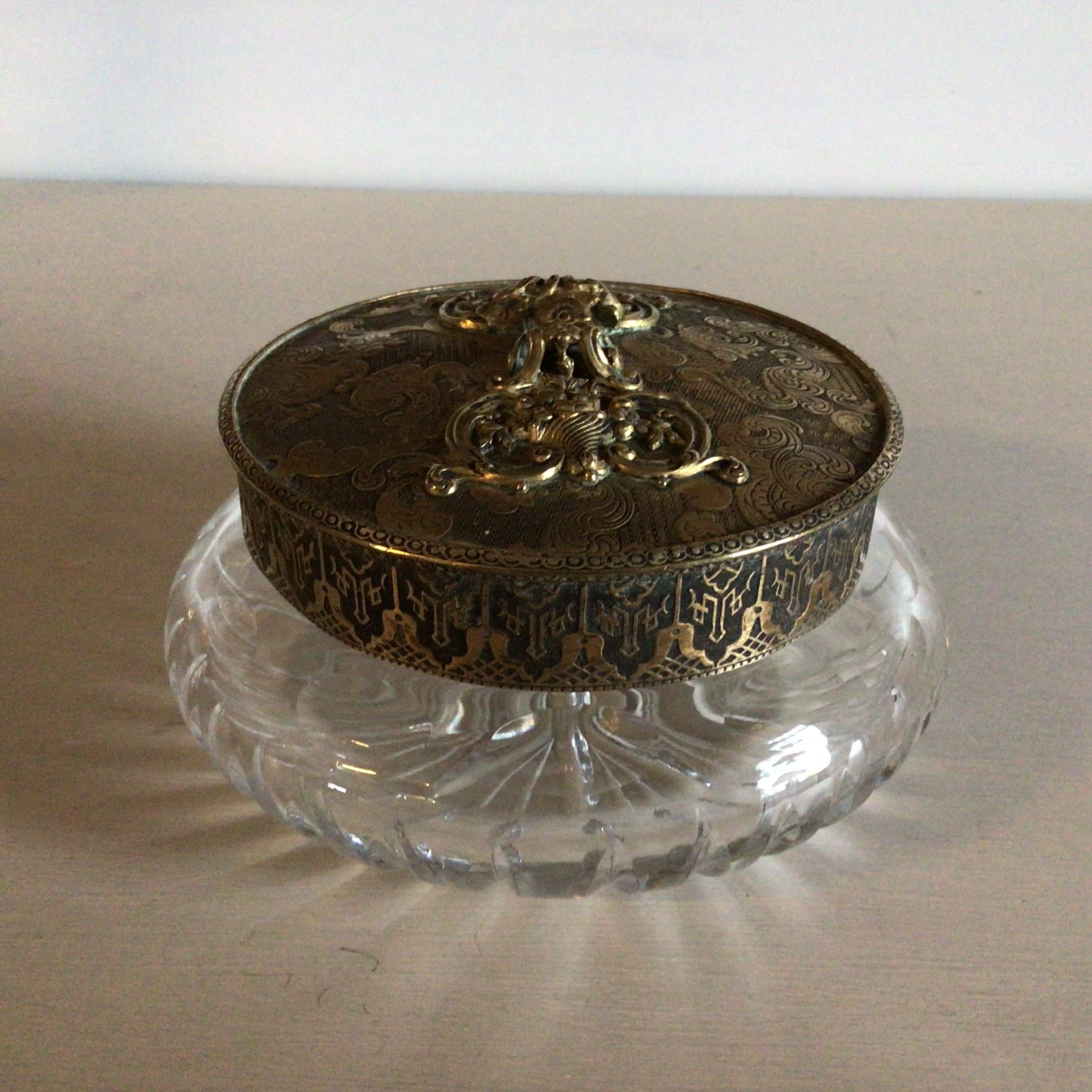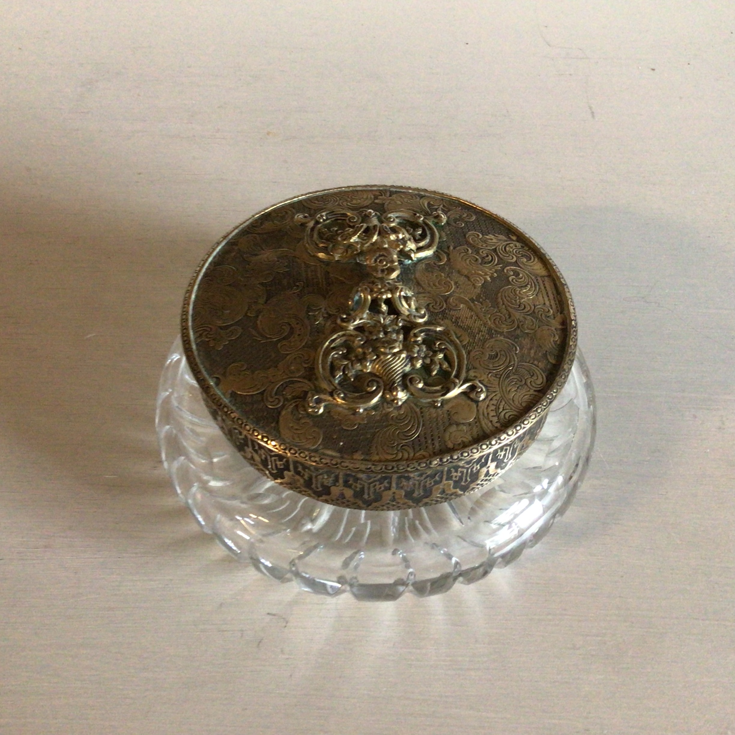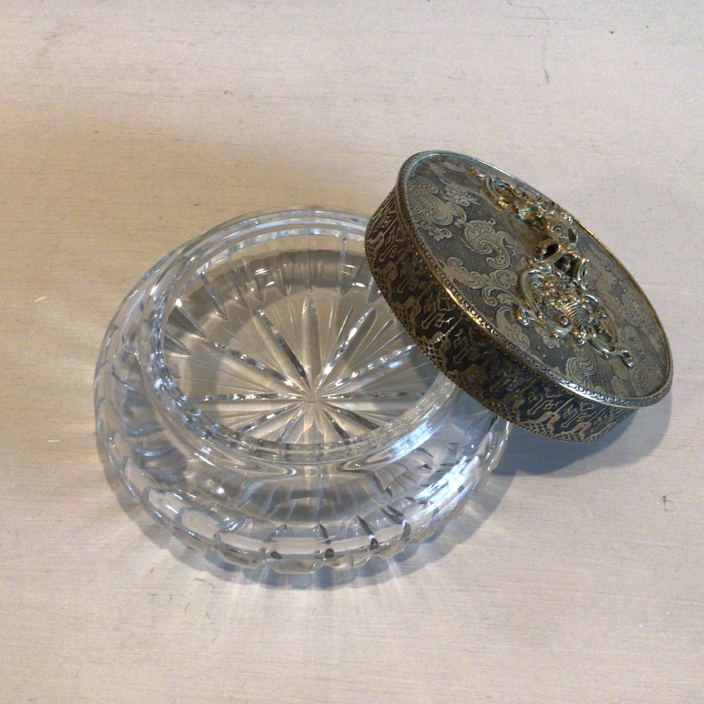 Smuk Bonbonniere i krystal låg af messing. Krystalskålen