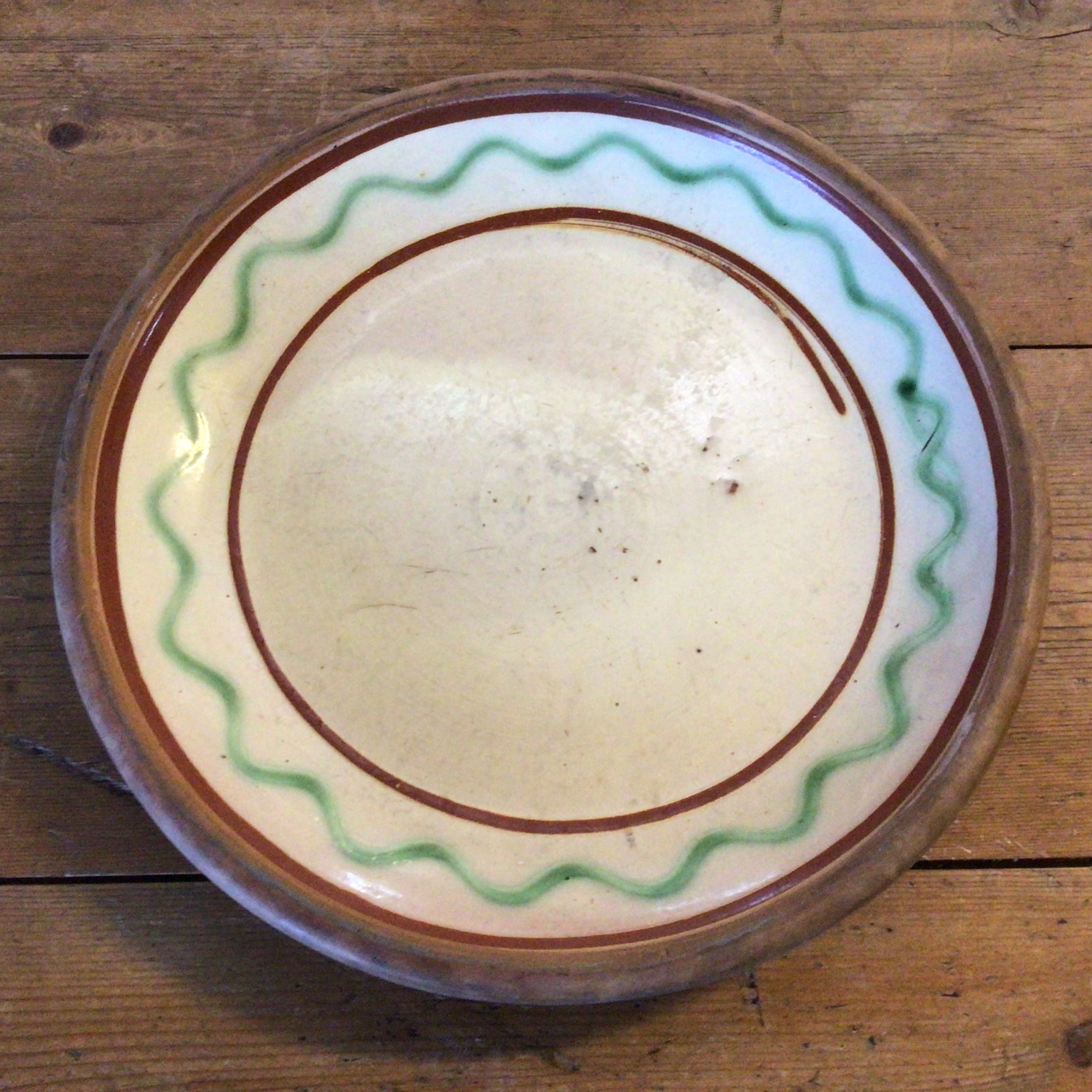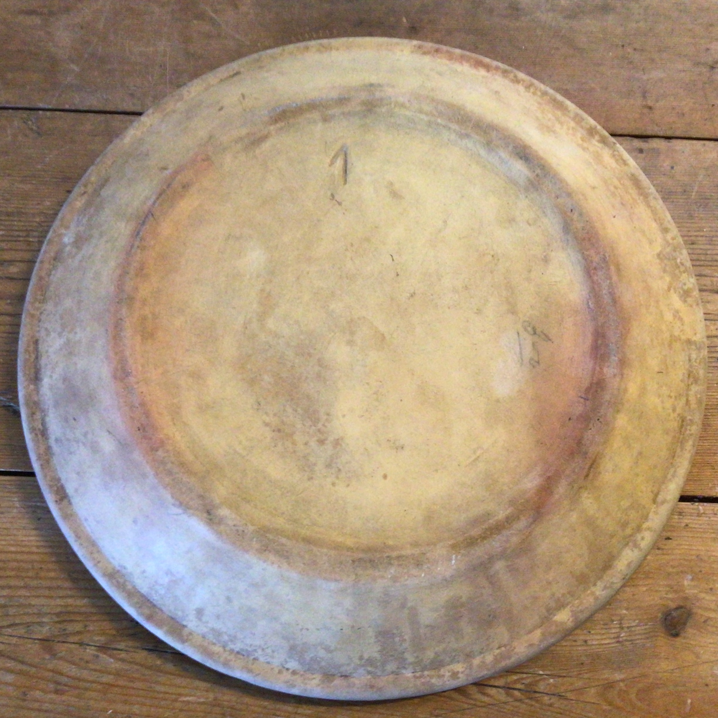 Dansk lertøjs pandekagefad. Forsiden glaseret i lys