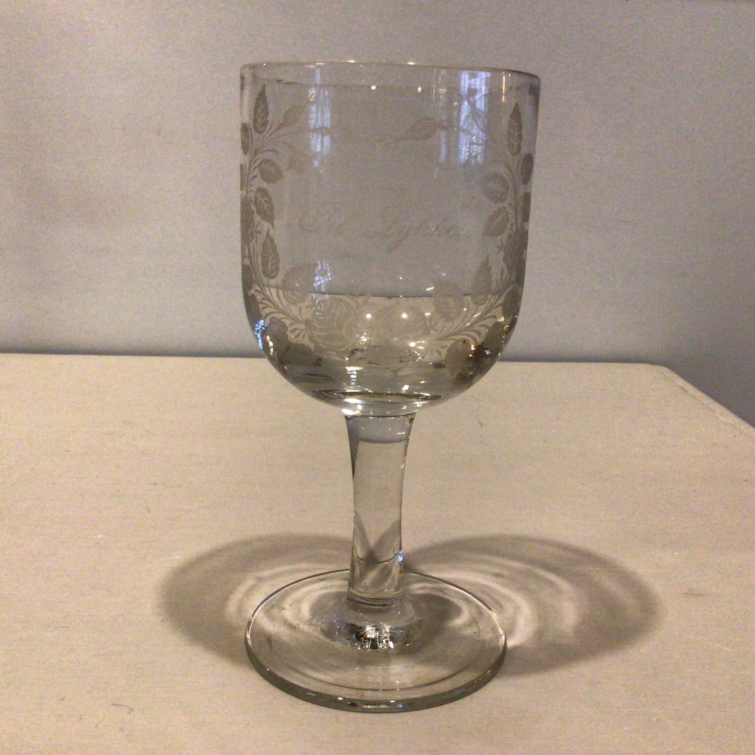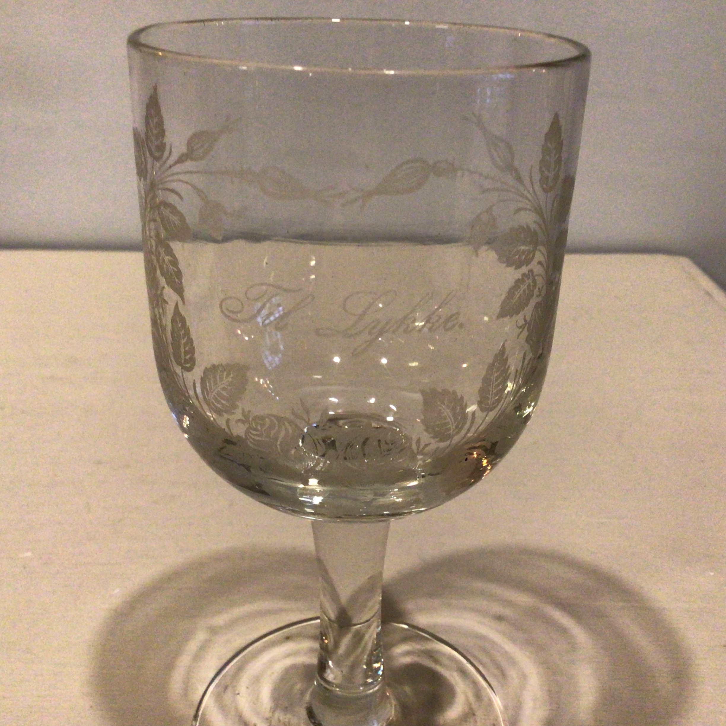 Erindringsglas med devisen “Til Lykke”. Erindringsglasset
