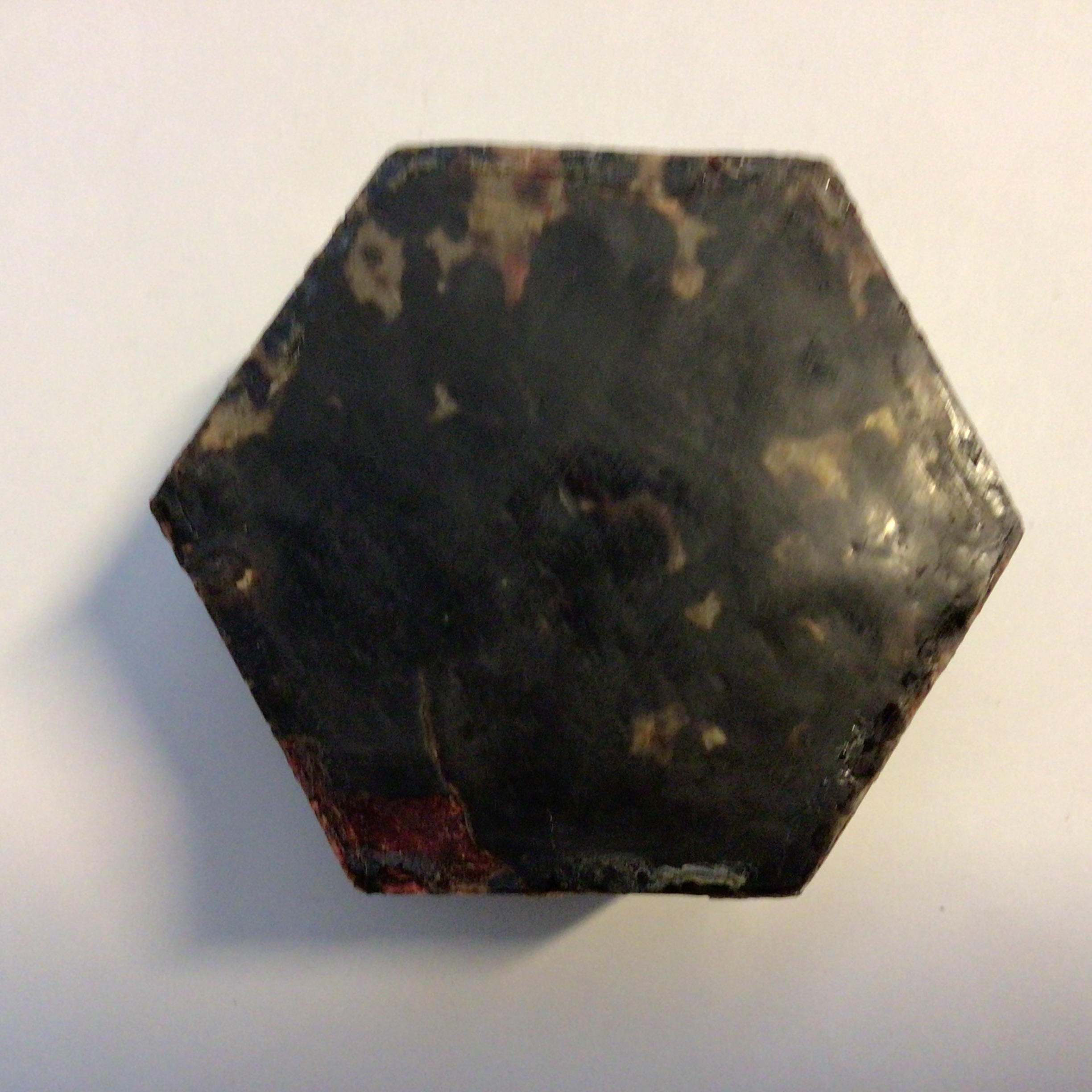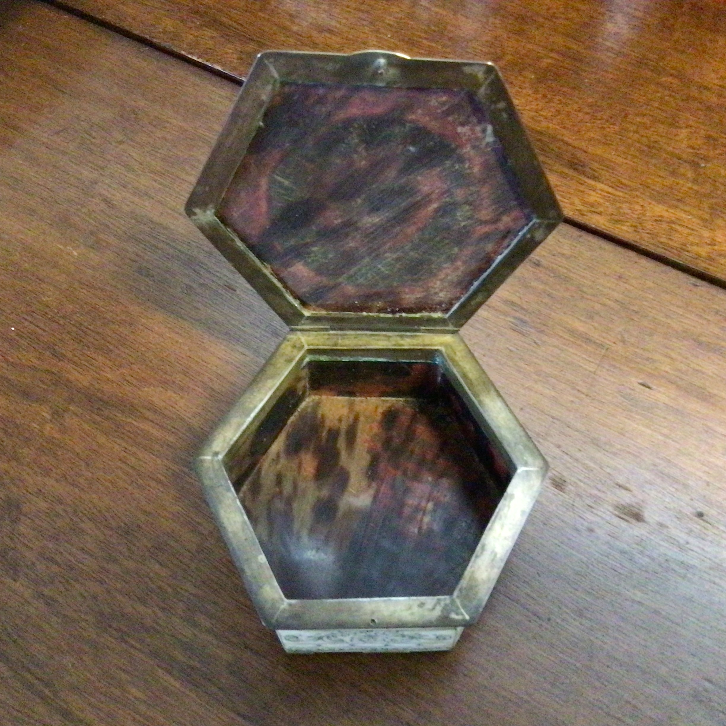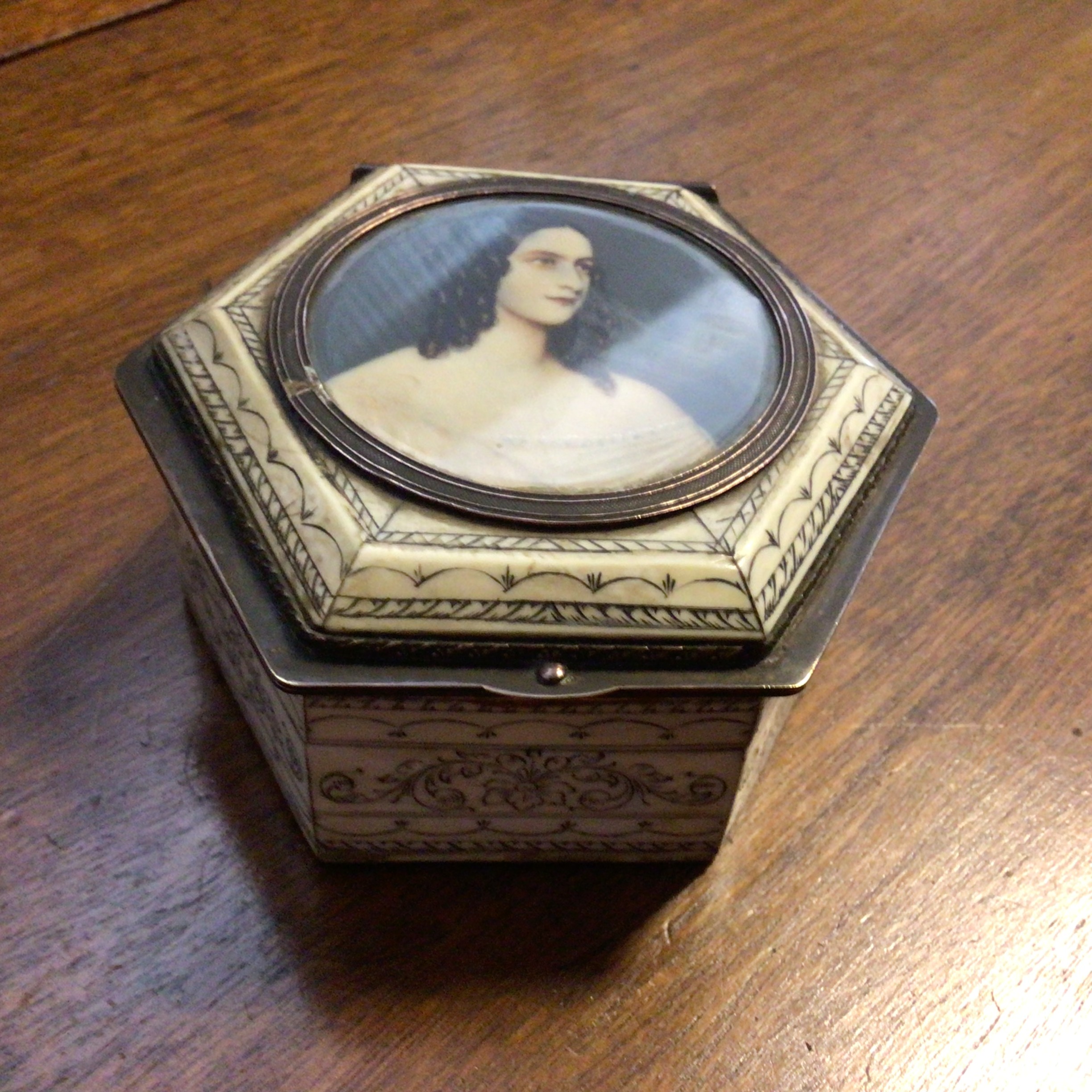 Dåsen er sekskantet med bronce beslag og dekoreret i ben – dåsens bund og