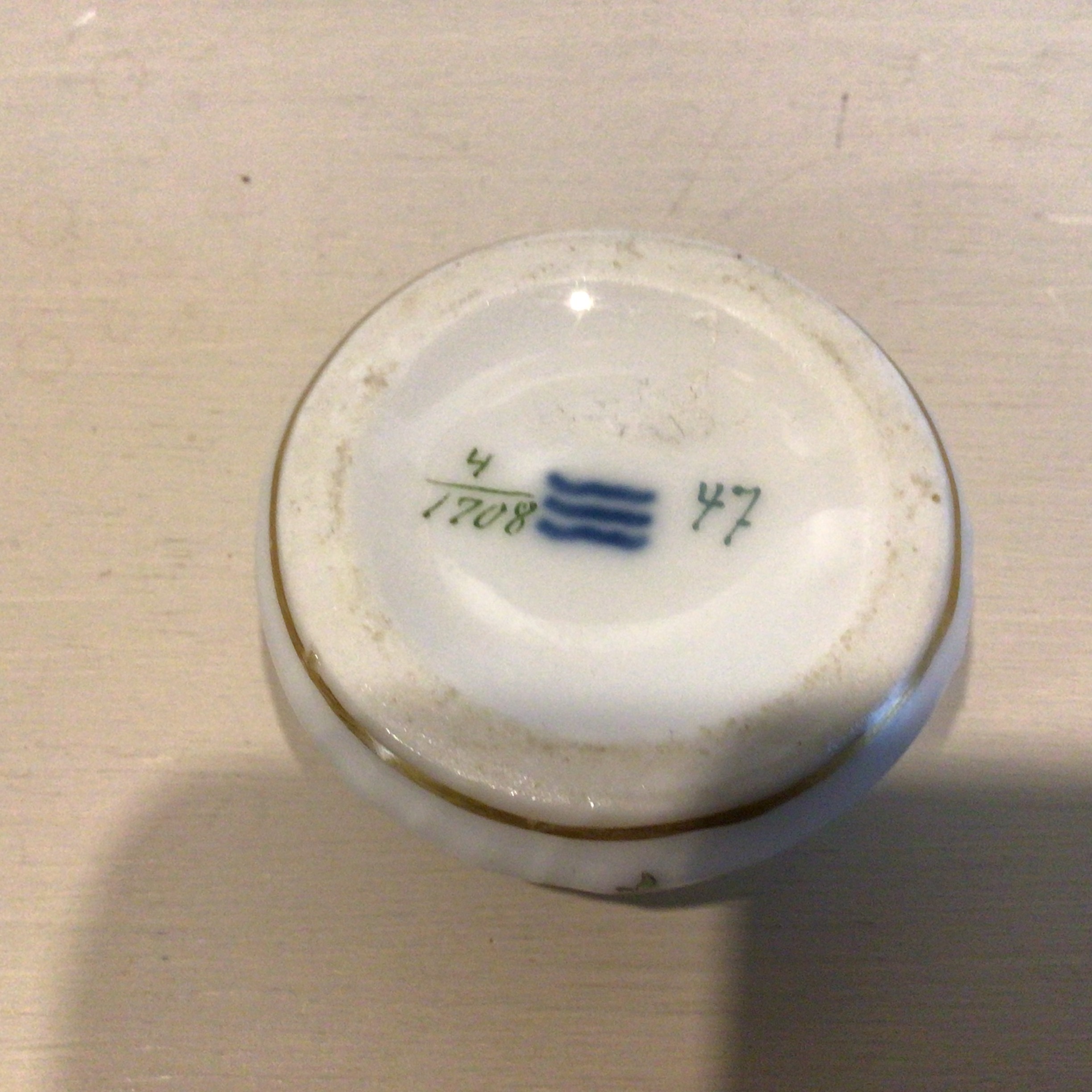 Mål: Højde 2 cm. Diameter åbning 3.4 cm. bund 4.5 cm.
