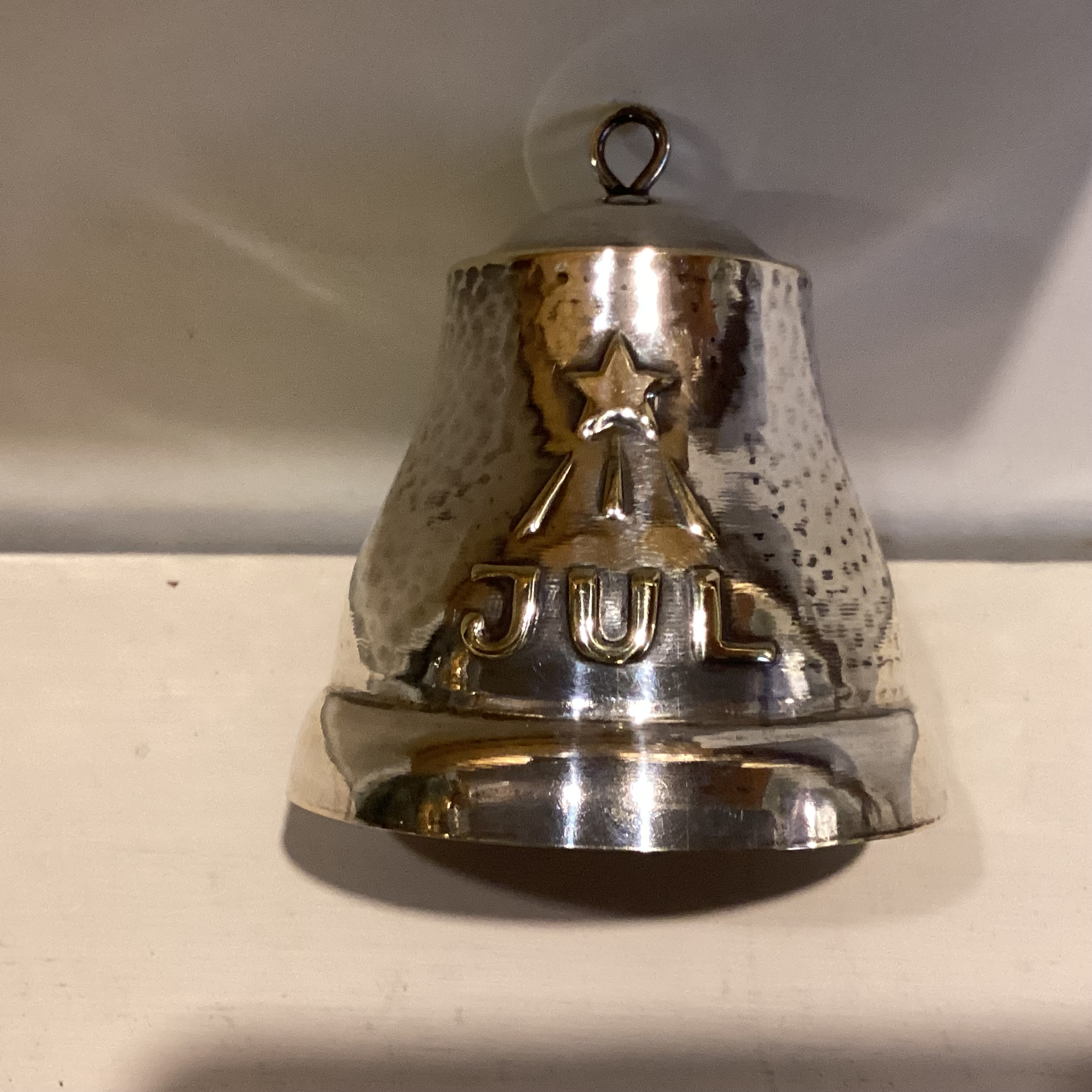 sølvplet prydet med stjerne og tekst JUL på begge