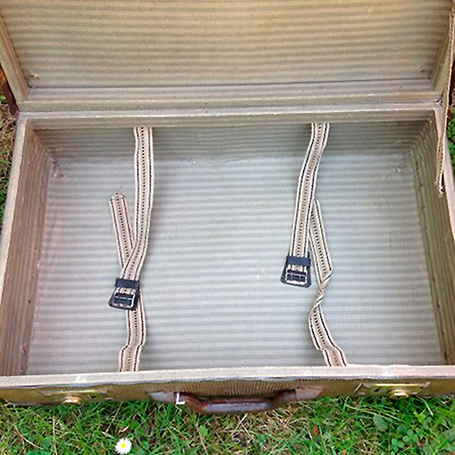 hårdt presset “pap”. Indvendigt beklædt med stribet stof og stropper til at holde