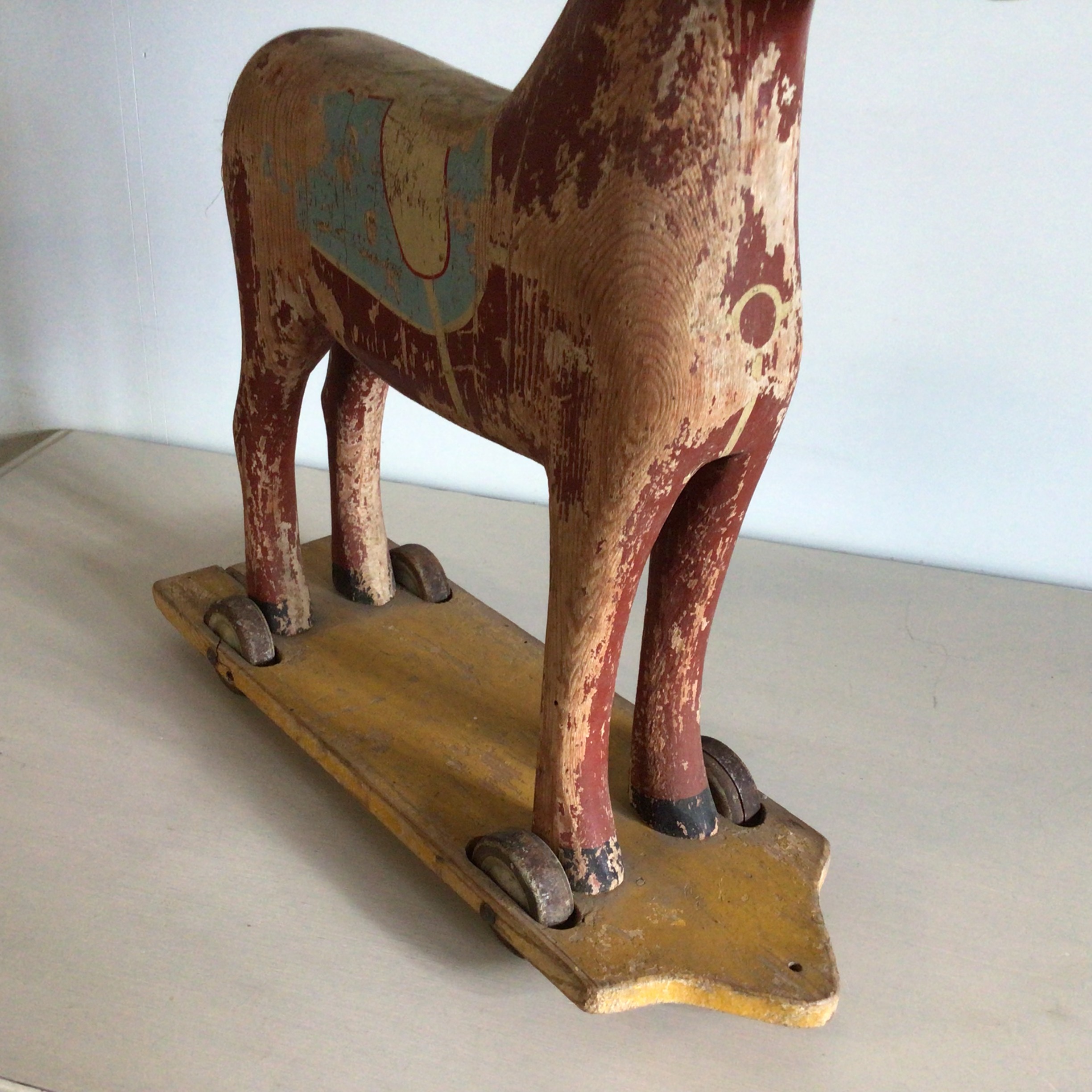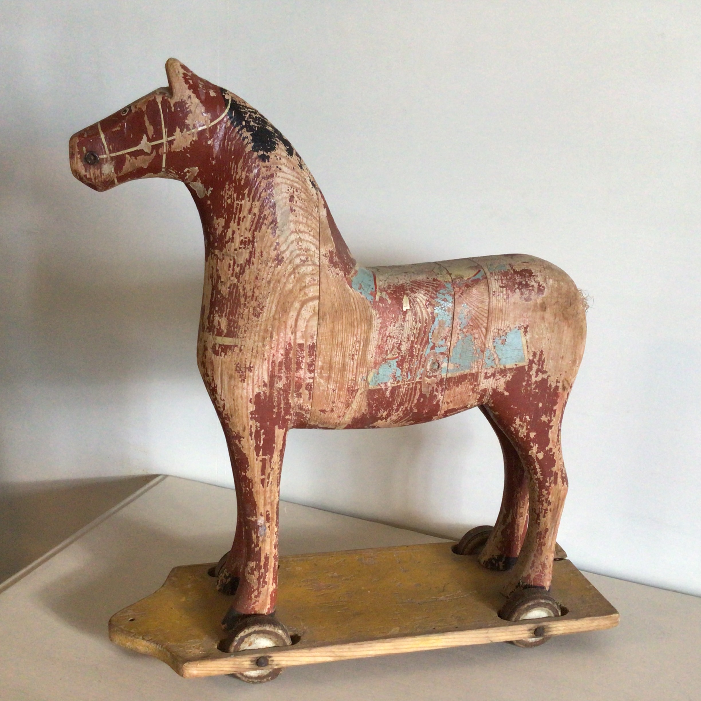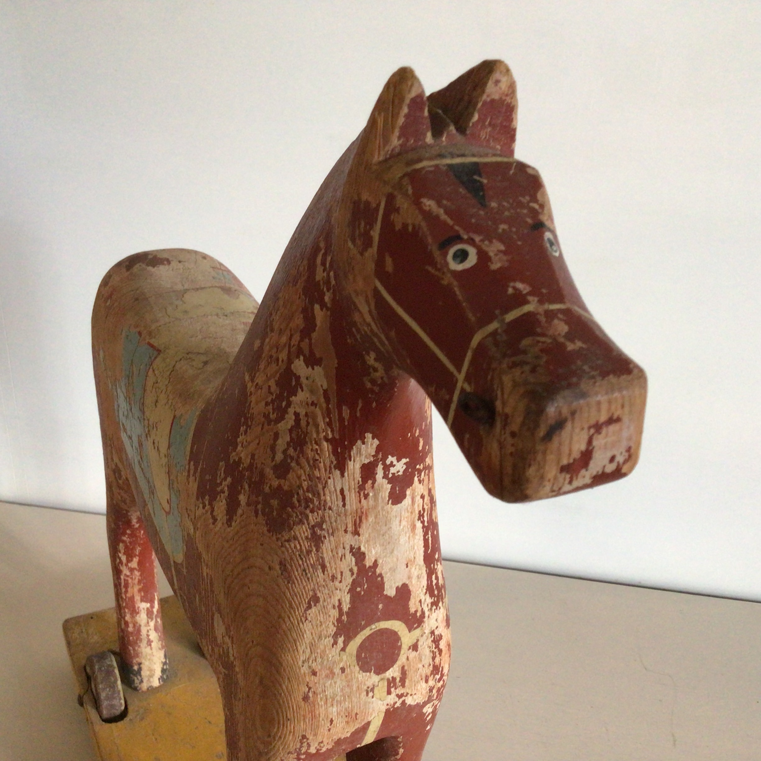 har været træksnor. Legetøjshesten har rester af gammel maling.