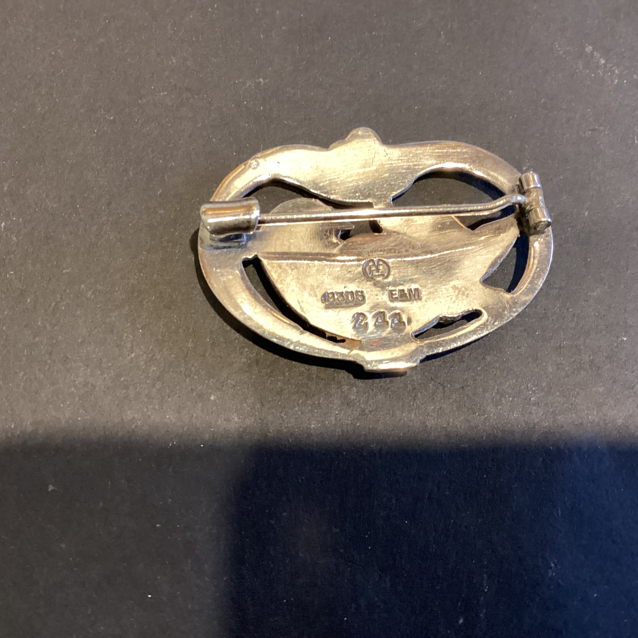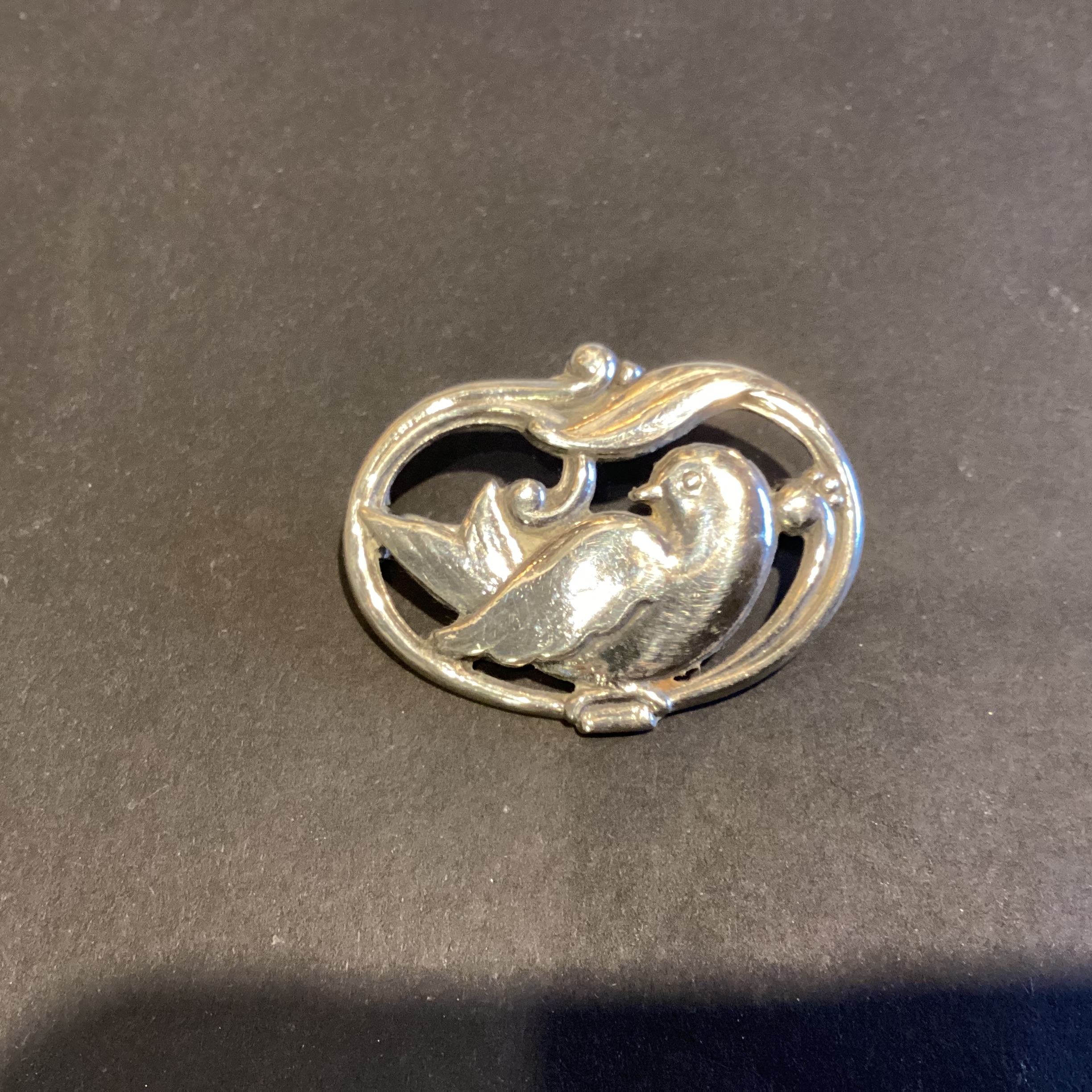 sølvbroche prydet med fugl stemplet E&M 830S design nr. 211.