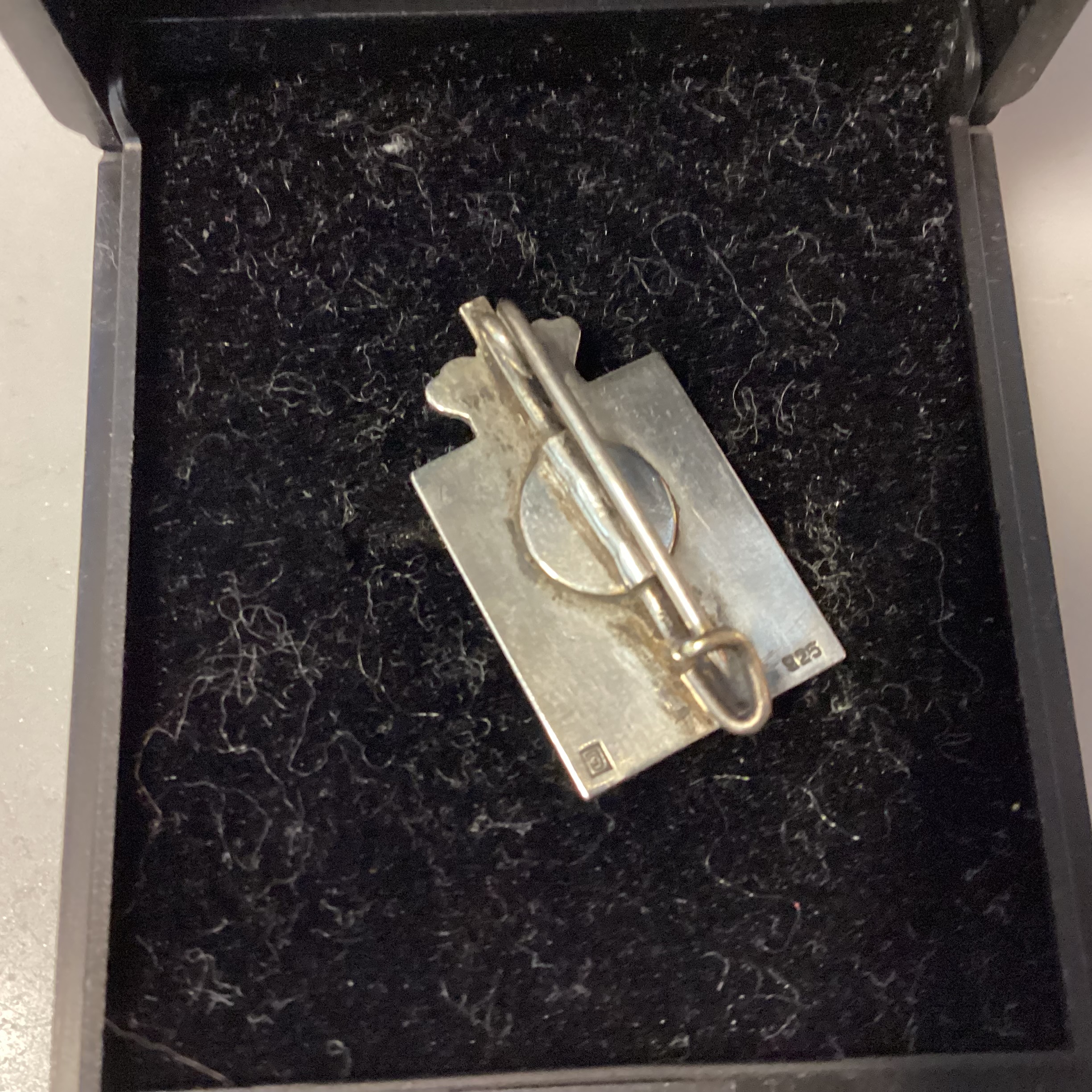 og udført hos Georg Jensen i sterling sølv og rød emalje.