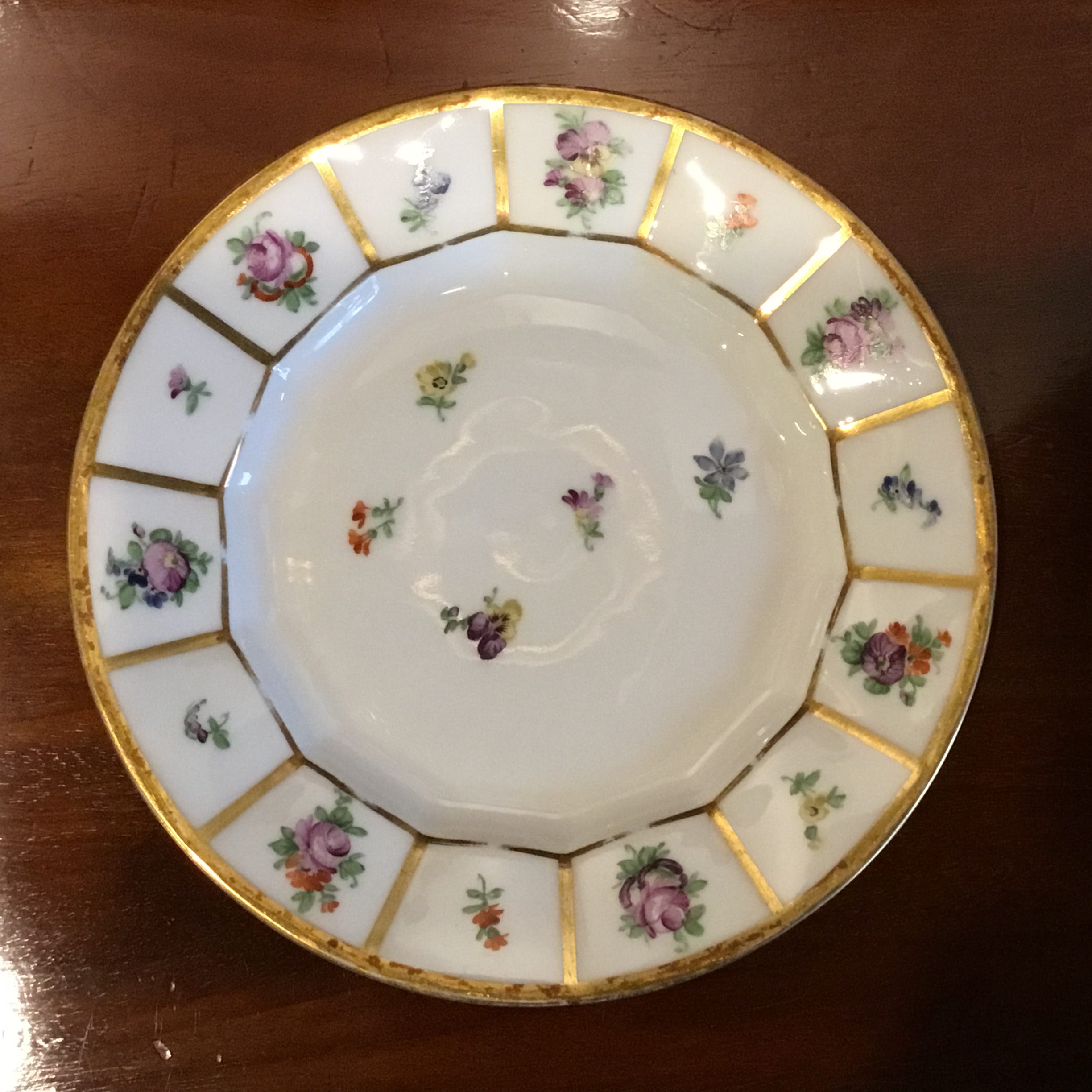 Henriette kagetallerken #8553 er malet med yndige strø blomster og guldkanter.