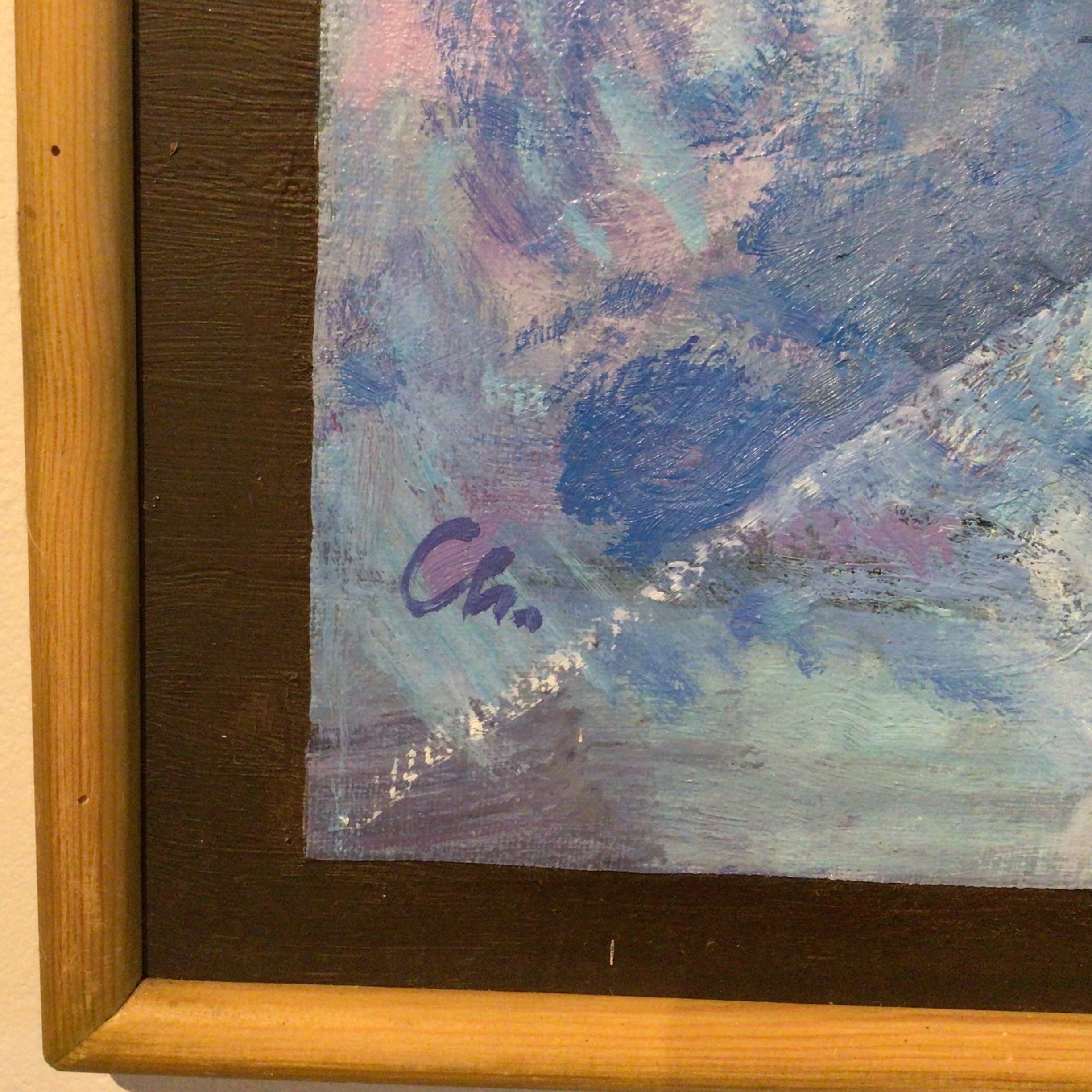 med de skønneste blå farver. Glat ramme i lyst træ.
