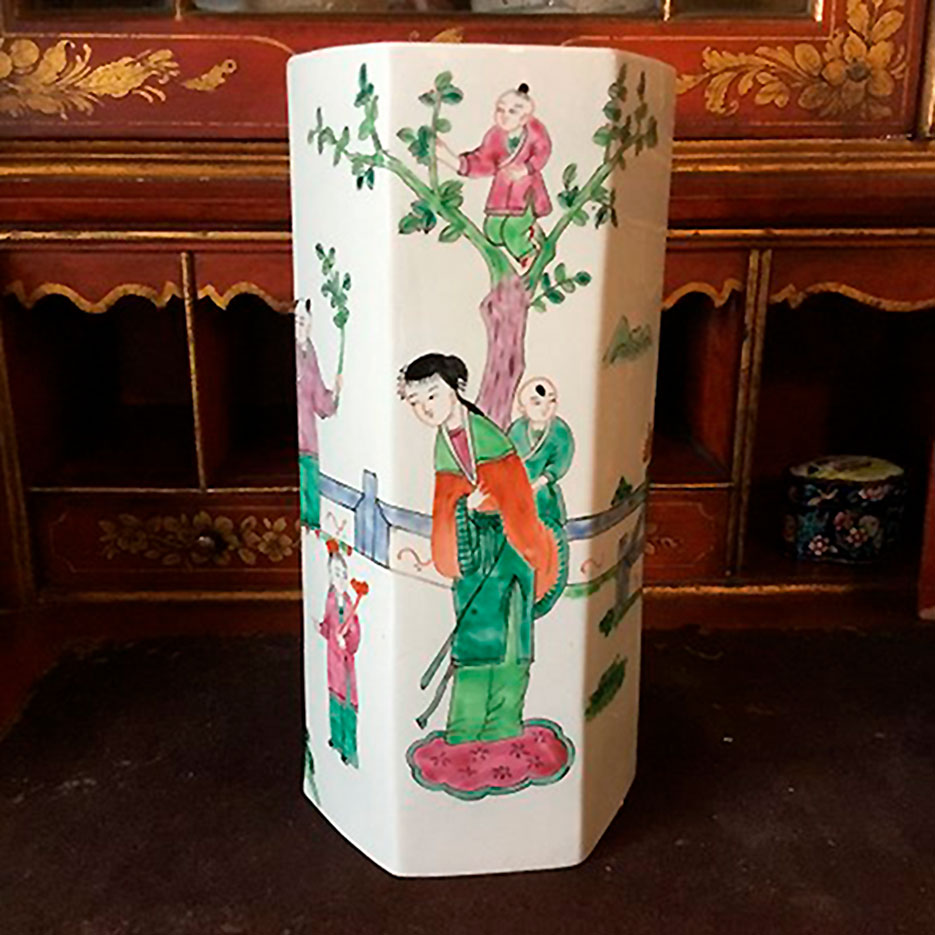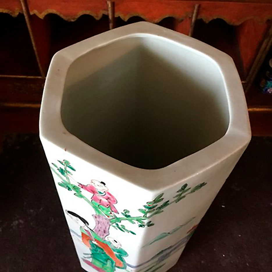 Dekorativ kinesisk vase i sekskantet porcelæn.