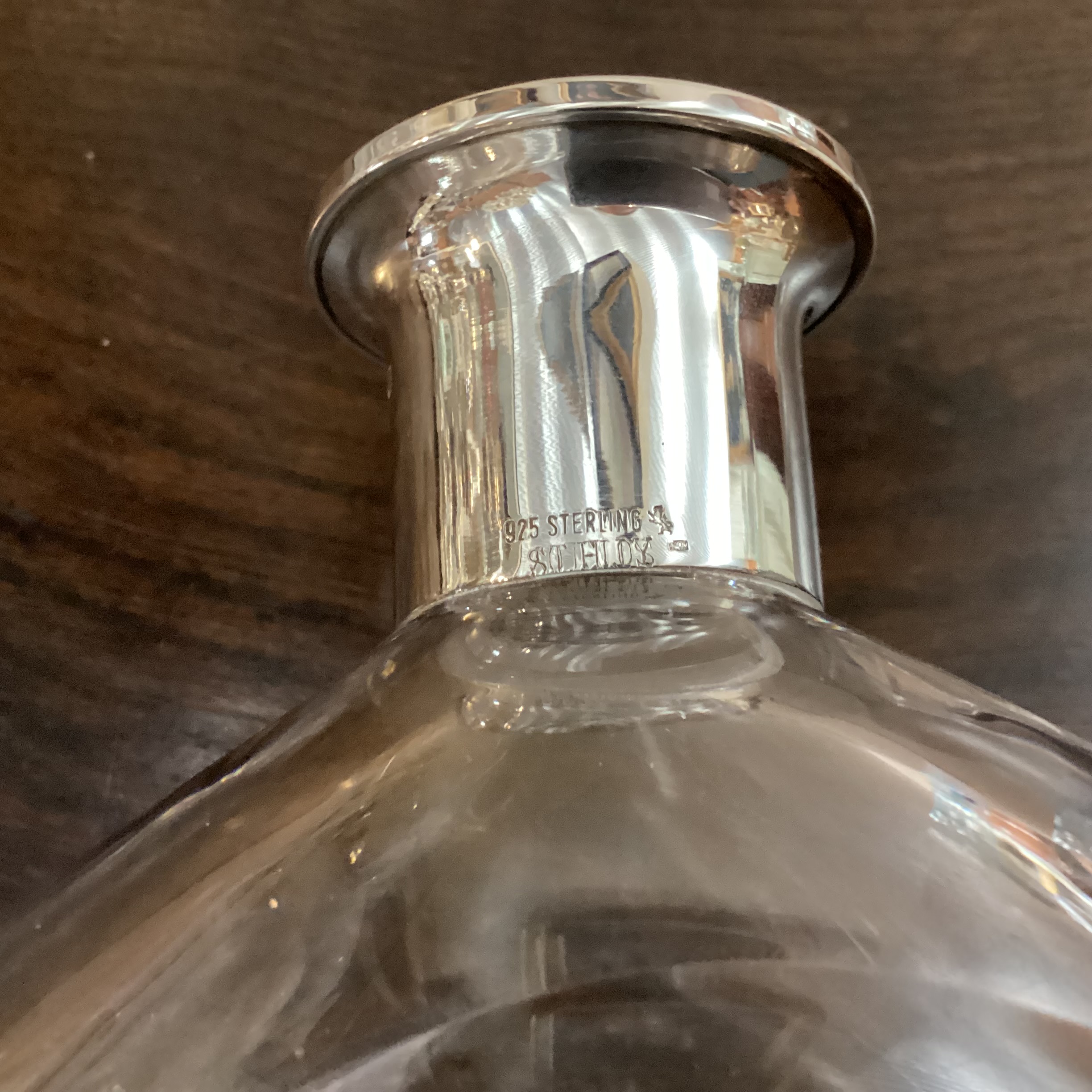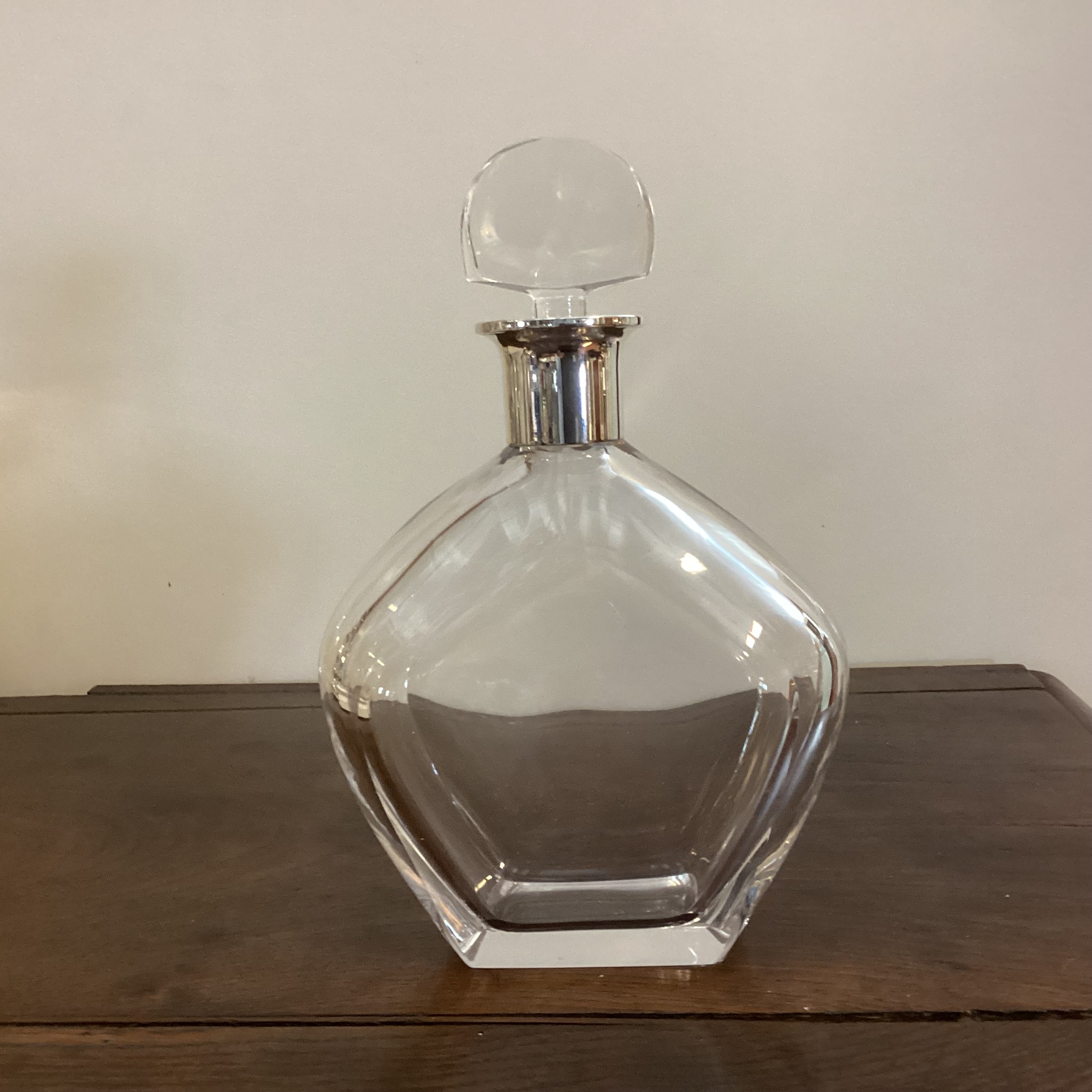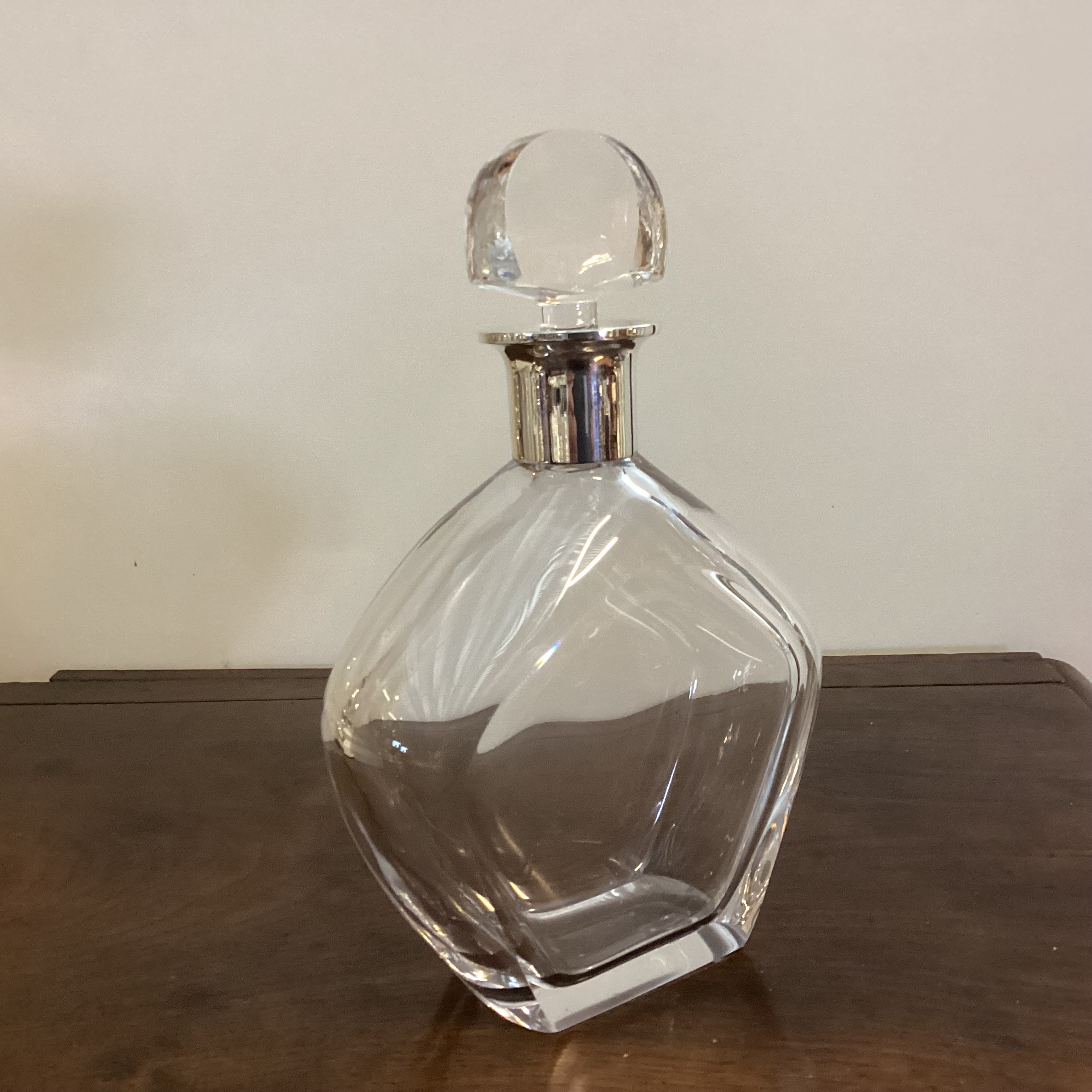 Elegant klar krystal karaffel med sølv hals. Klar krystal karaffel med sølv