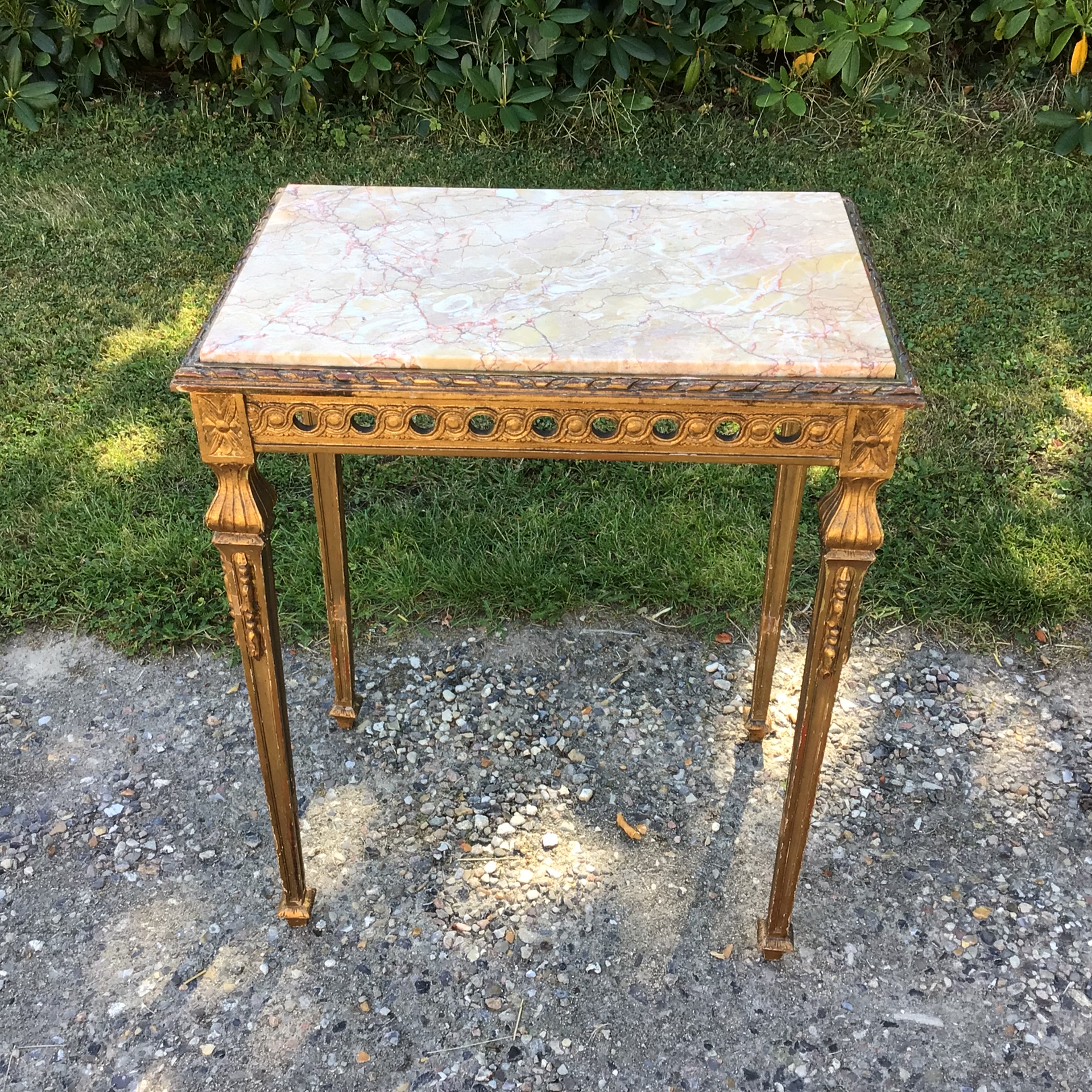 tilspidsede ben. Marmorpladen er lys broget. Bordet fremstår med