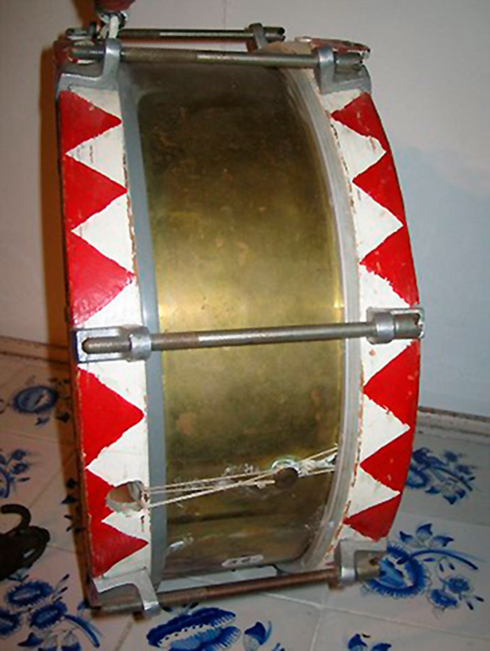 March-trommen er i messing og malt i mønster med rød og hvid farve.