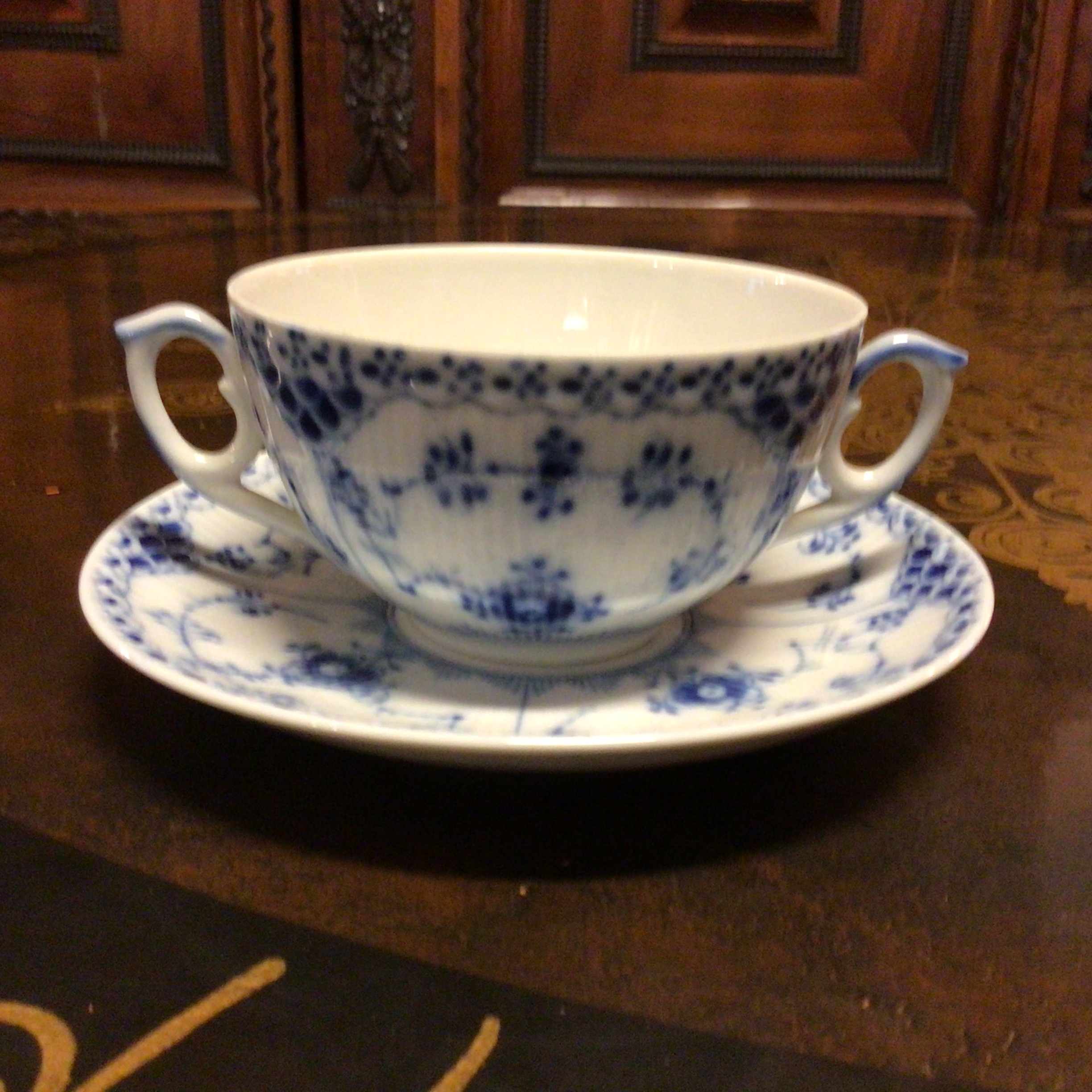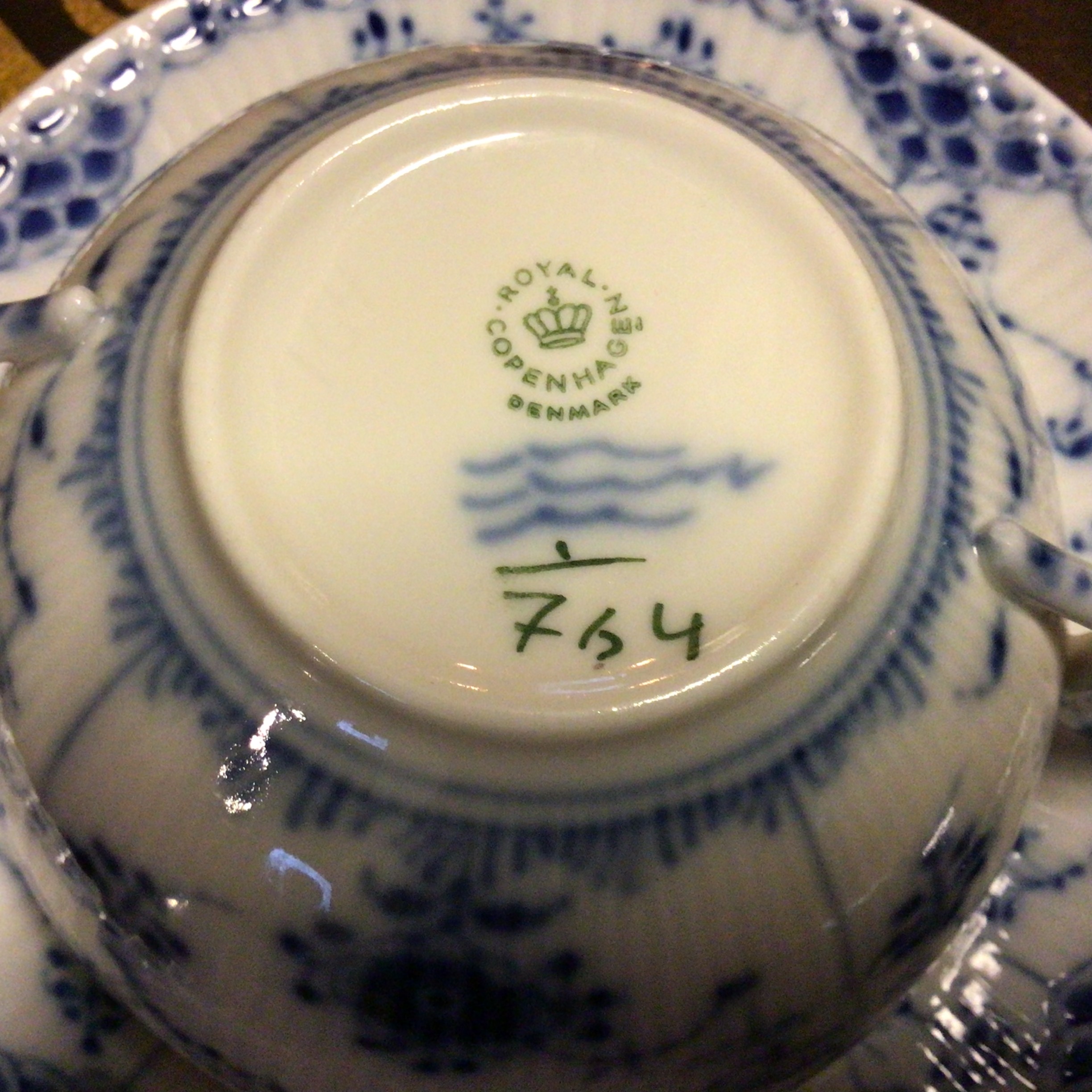 Royal Copenhagen Musselmalet Halvblonde Bouillonkop #764 med underkop