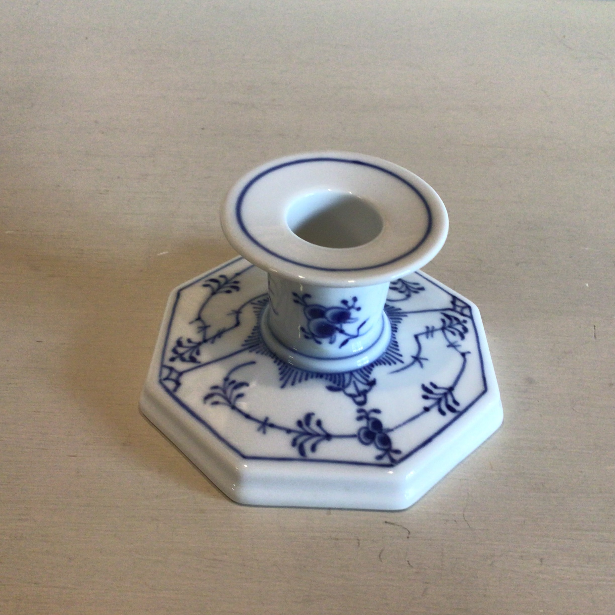 lysestage har en ottekantet fod og er i riflet porcelæn. 1. sortering.