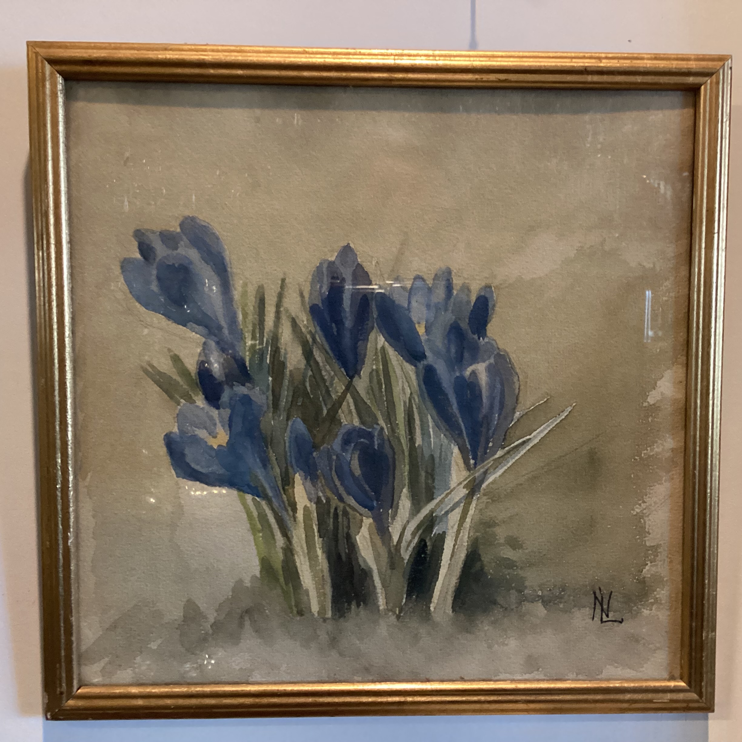 akvarel Blå Krokus isat smal profileret guldramme bag glas. Signeret.