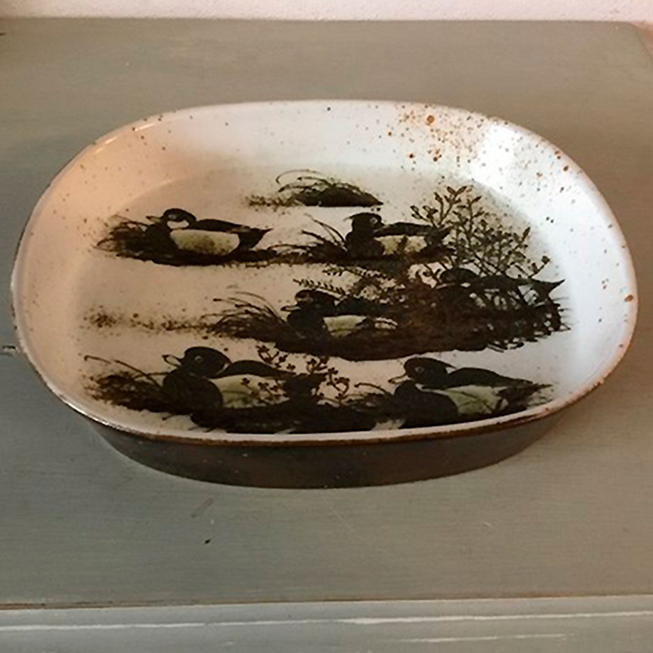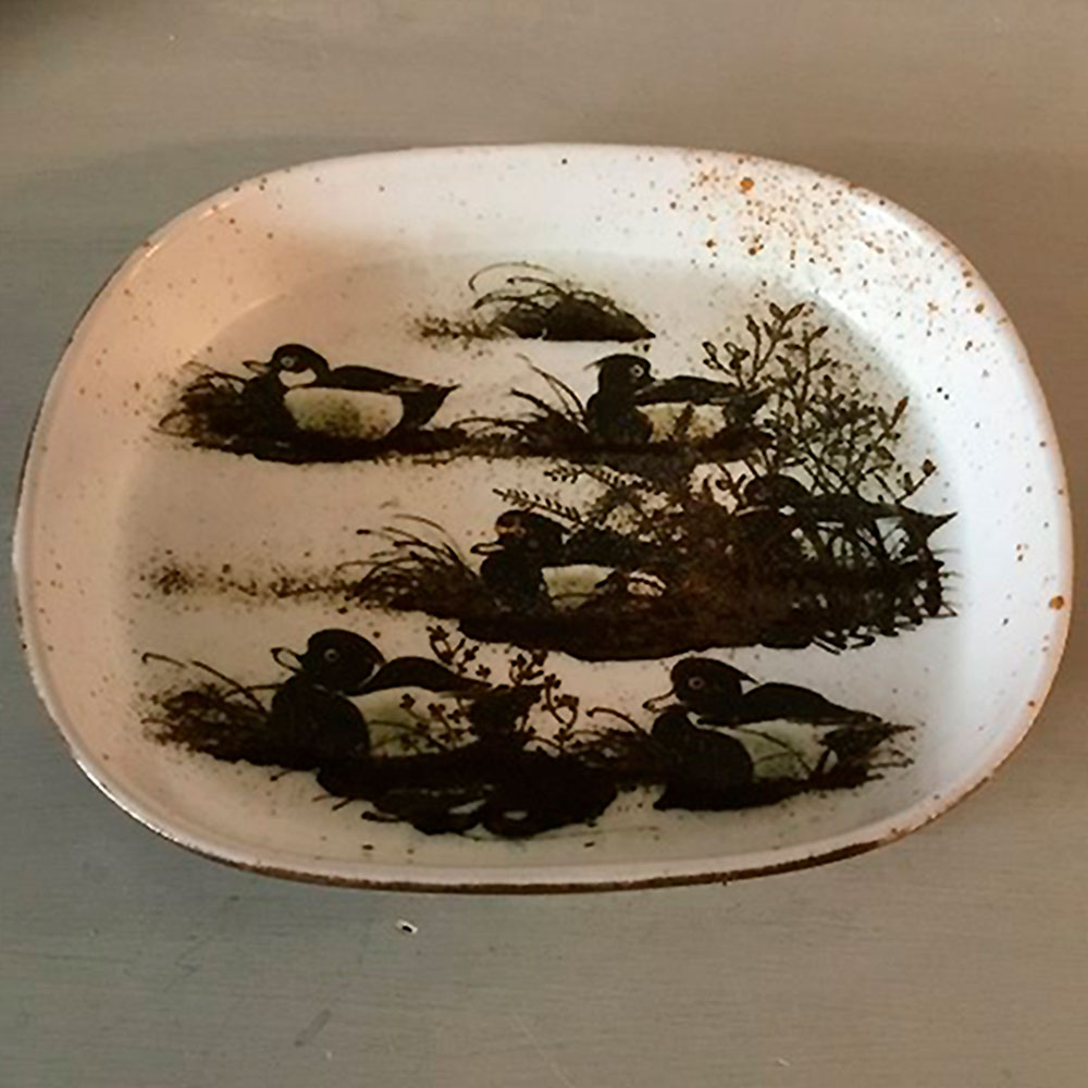 Stentøjsskålen/fadet er med lys bundfarve, som er dekoreret med troldænder