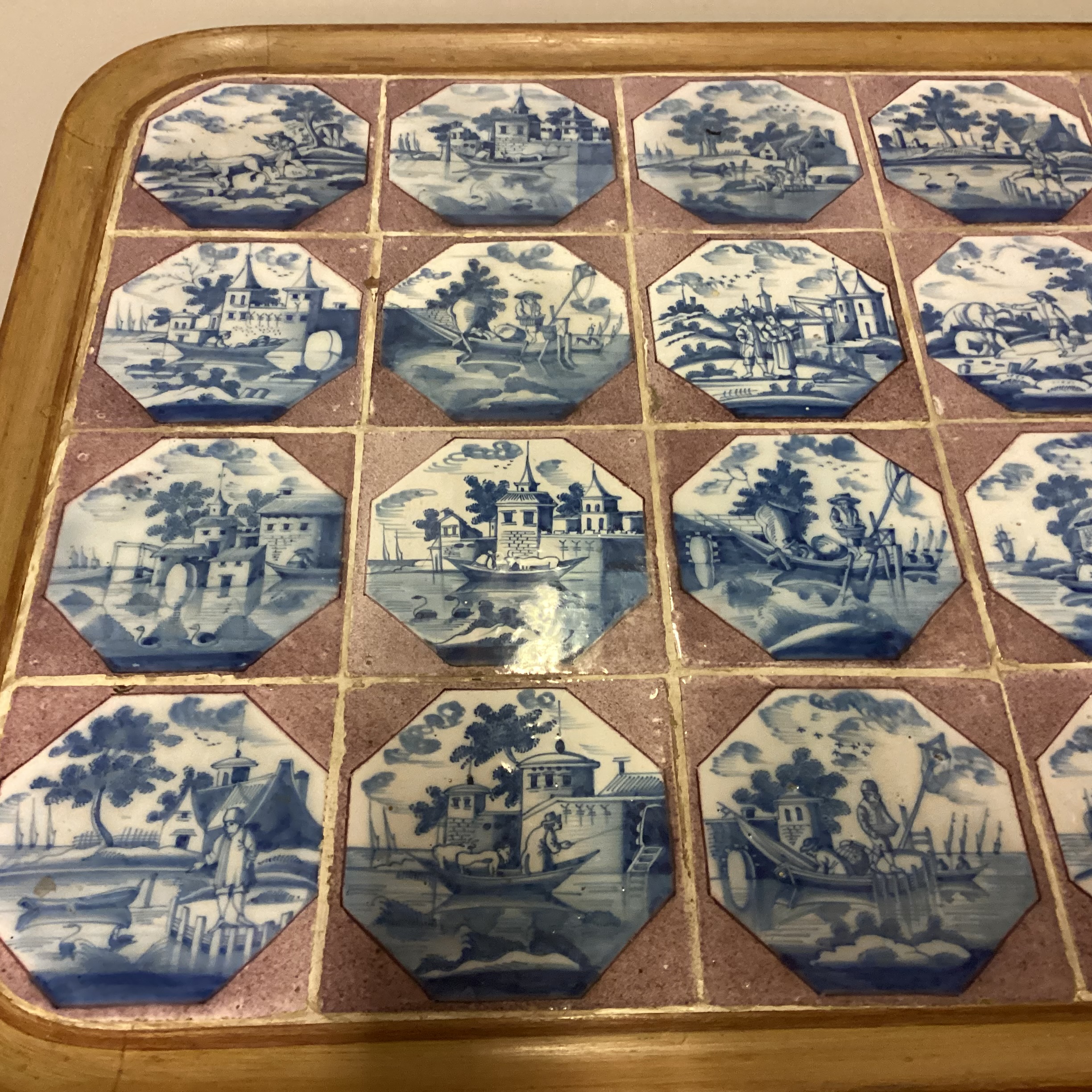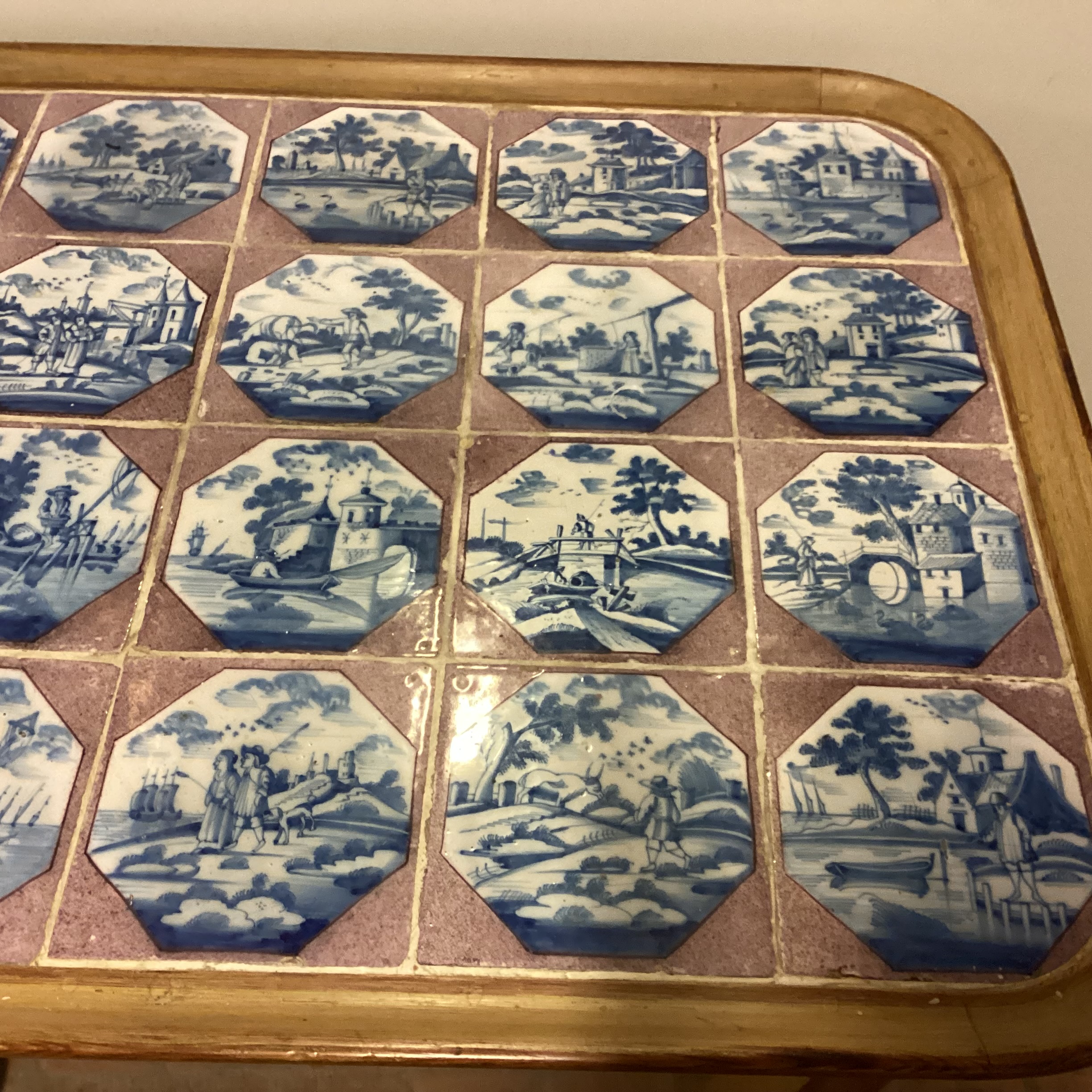 1700 tals fliser med personer og landskab omkranset af en manganfarvet