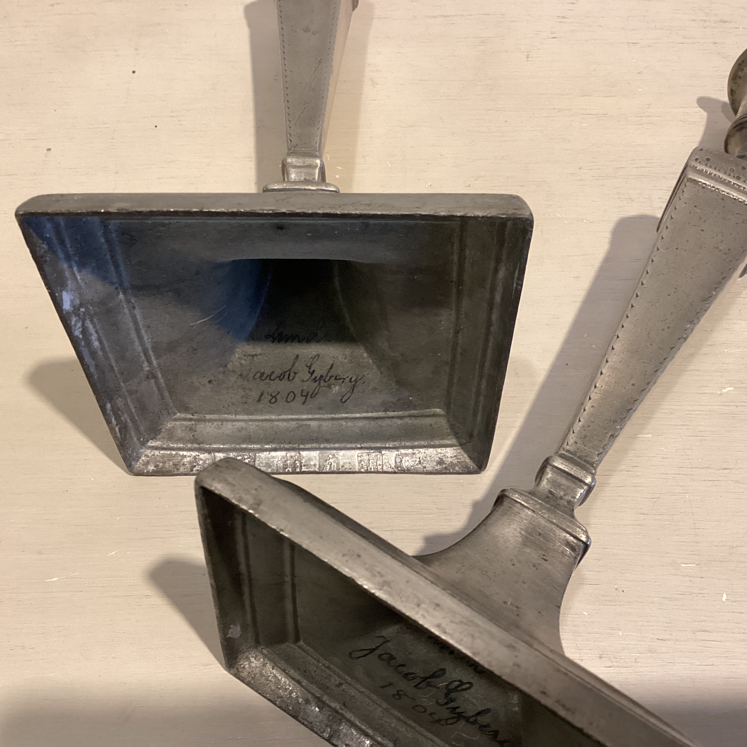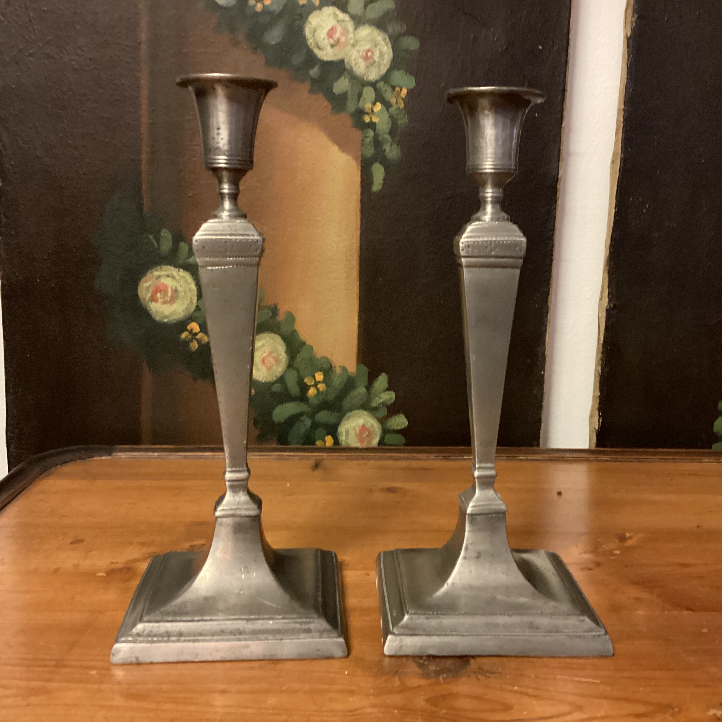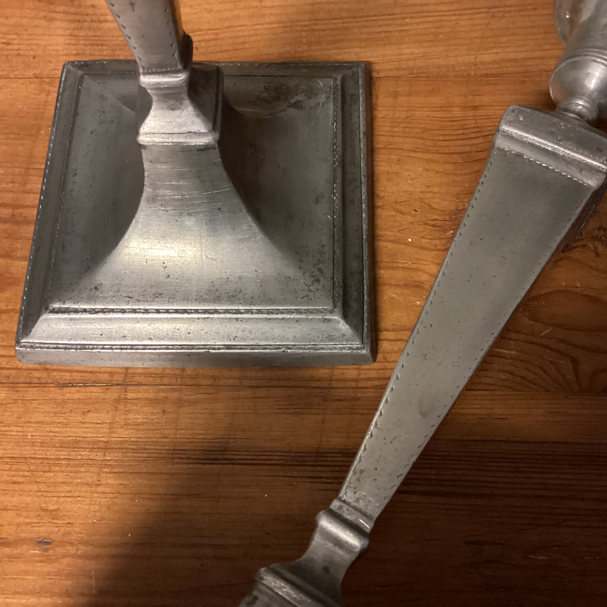 Par høje Louis XVI tin lysestager. Par høje Louis tin lysestager