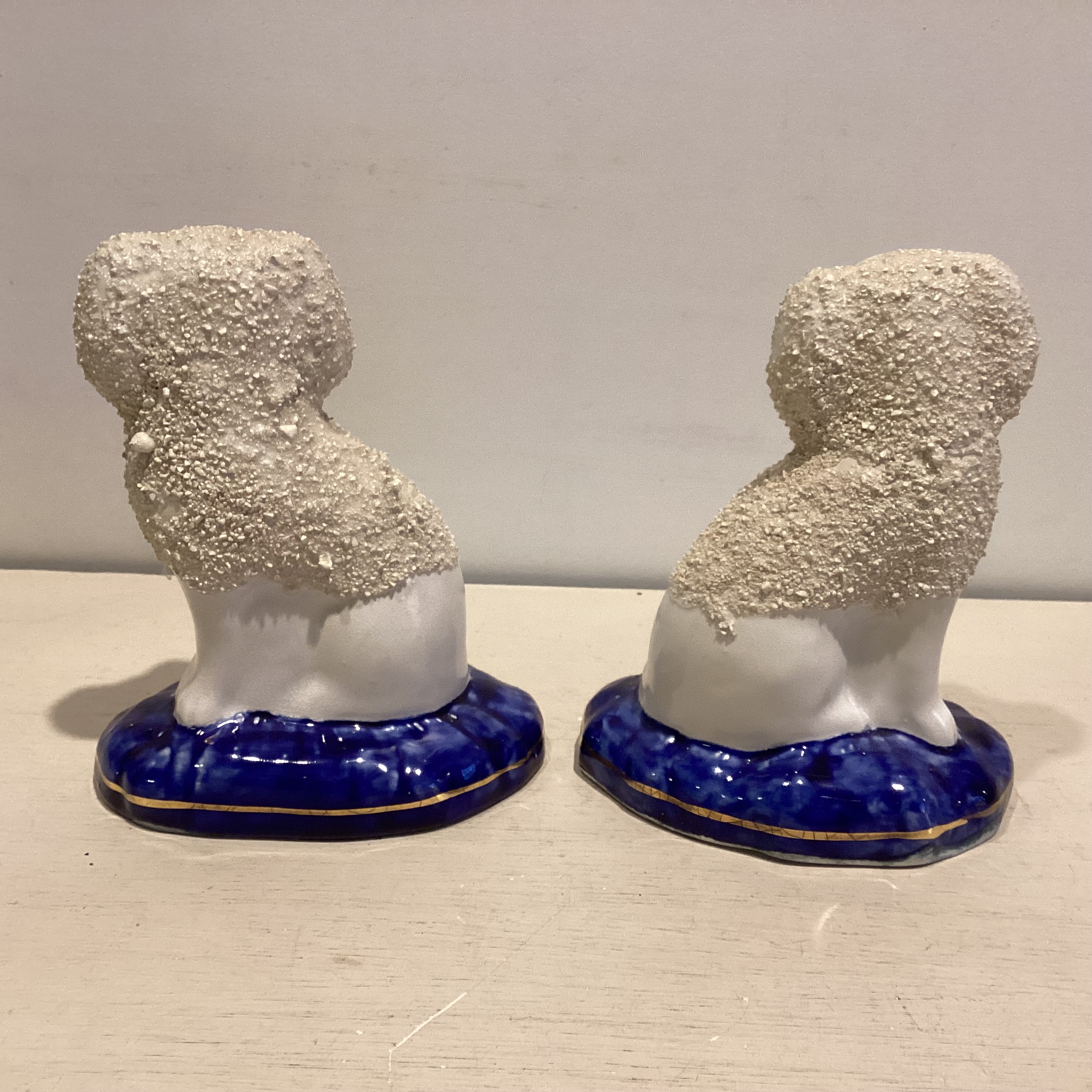 sokkel. Hundene er i fajance, hvide med krymmel med guld halsbånd