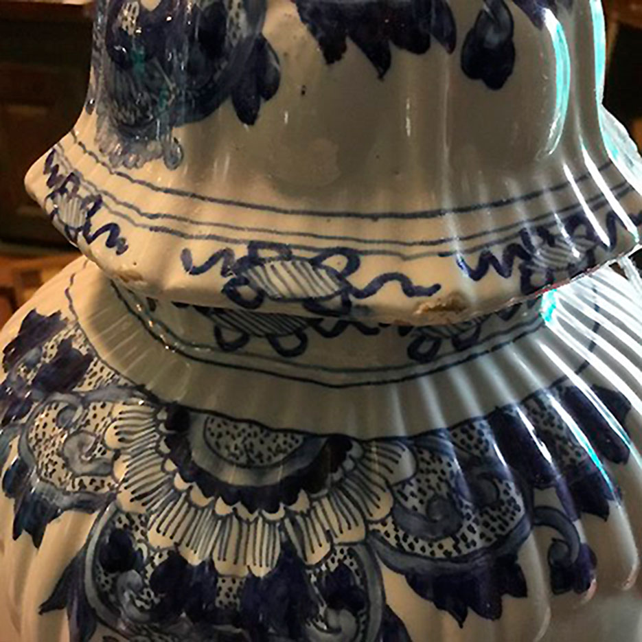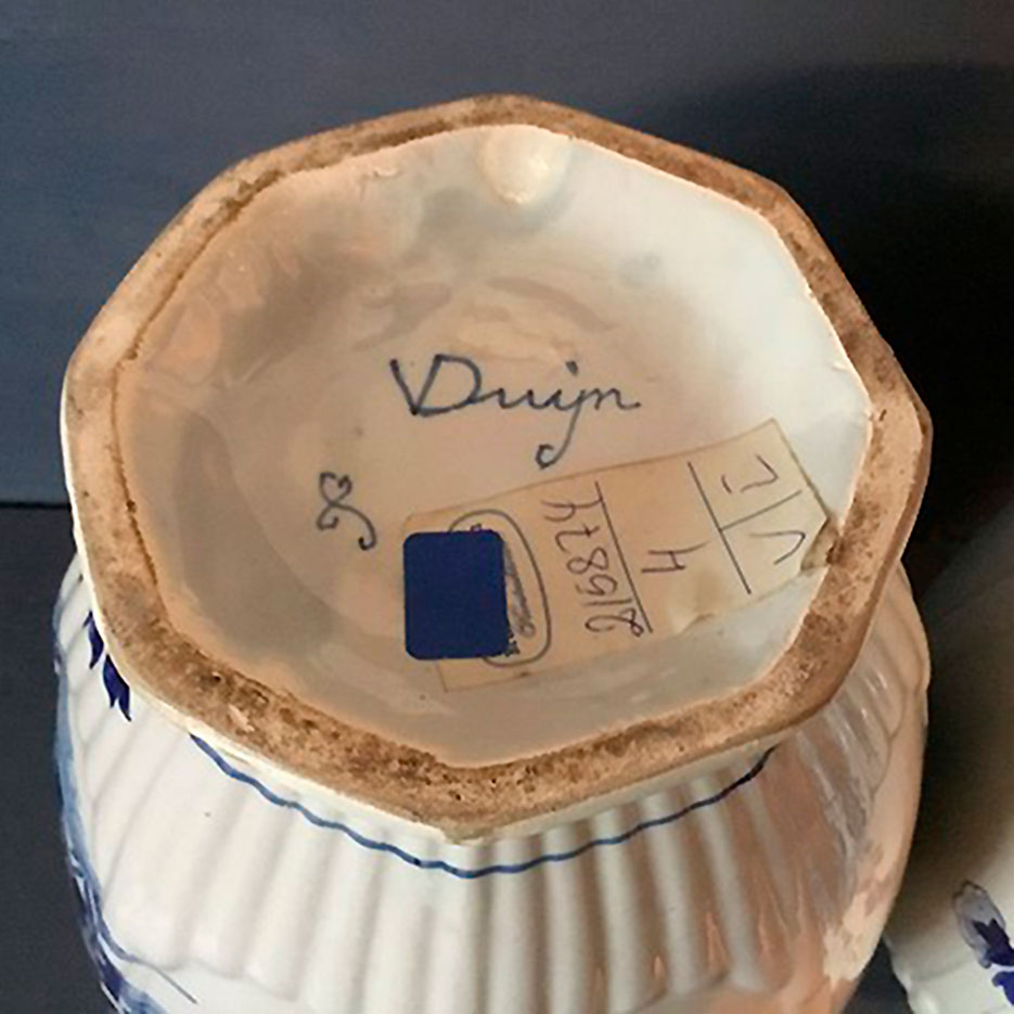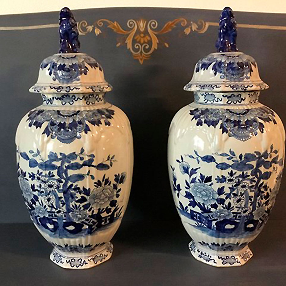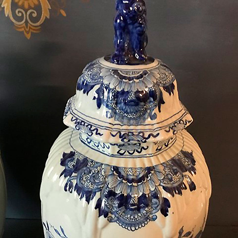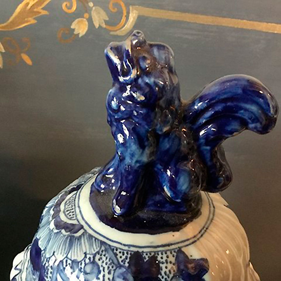Par store Delf Lågvaser er i fajance og har en blå dyrefigur på toppen af låget.