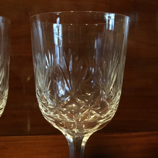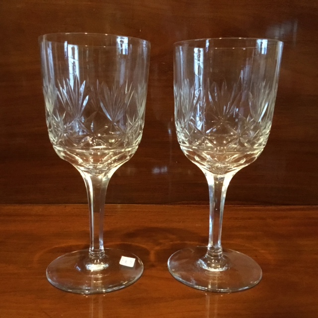 Et par store rødvinsglas i krystal. De flotte rødvinsglas har et smukt slebet mønster