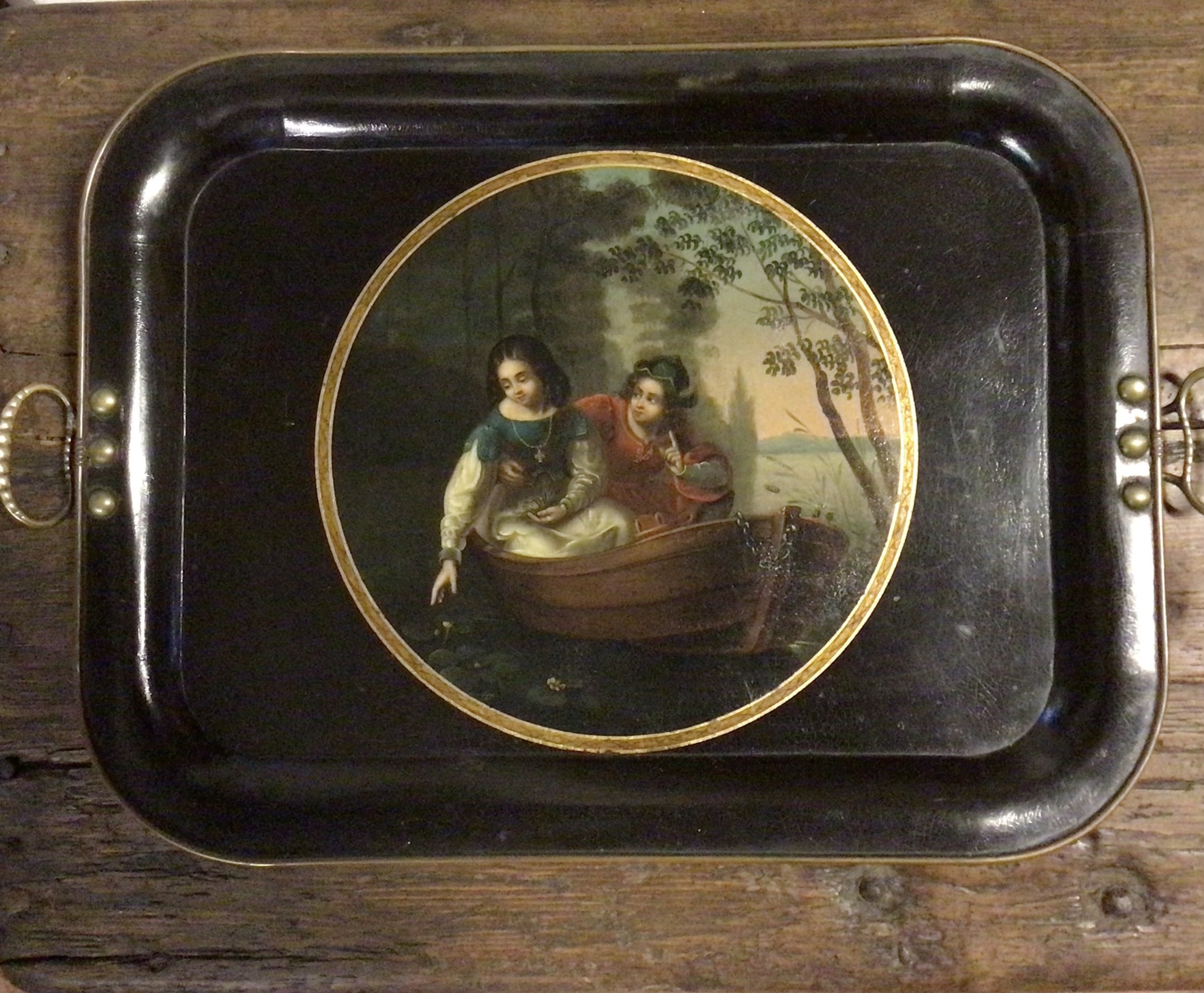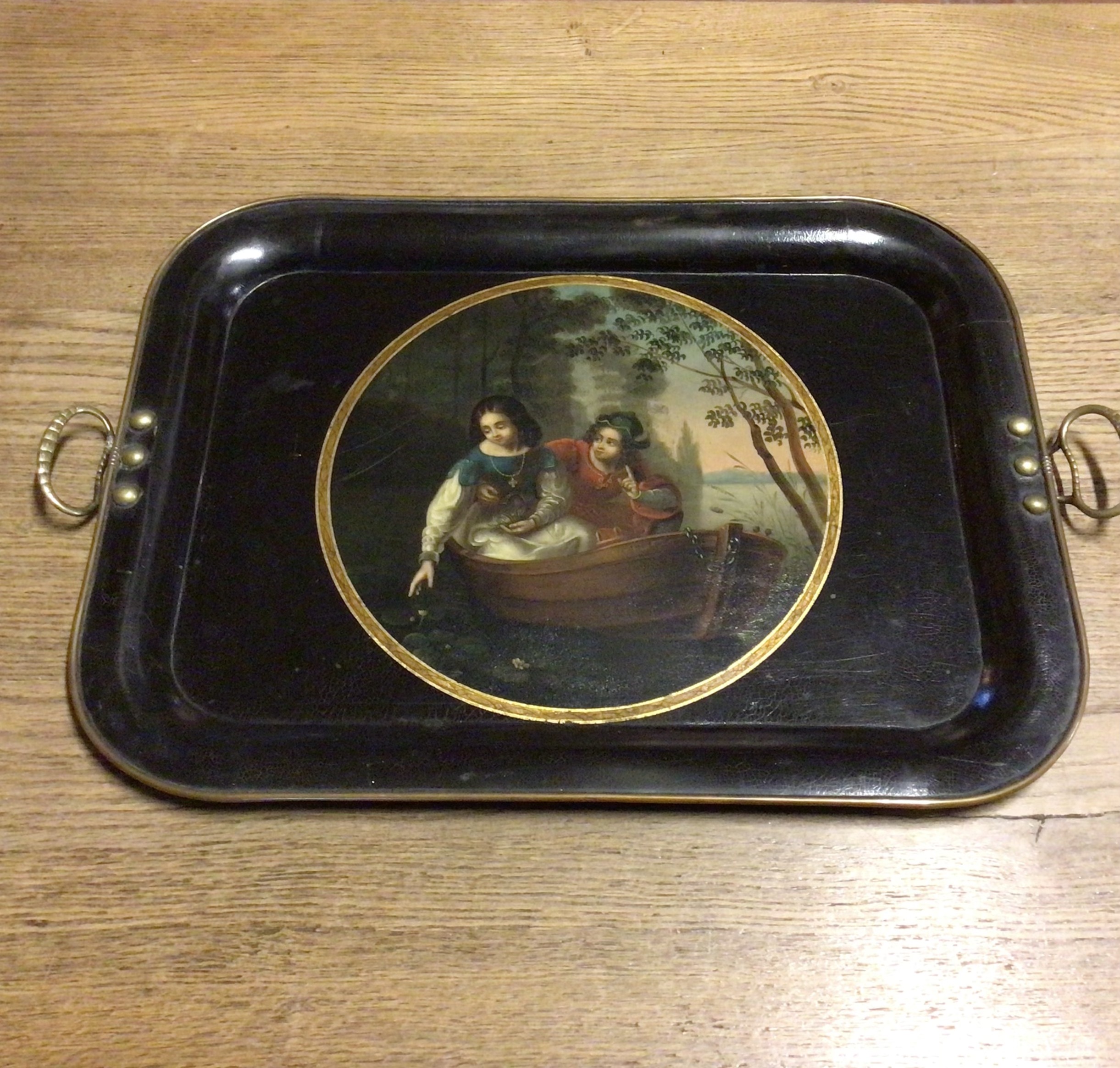 Skøn Regency metalbakke med romantisk maleri. Regency