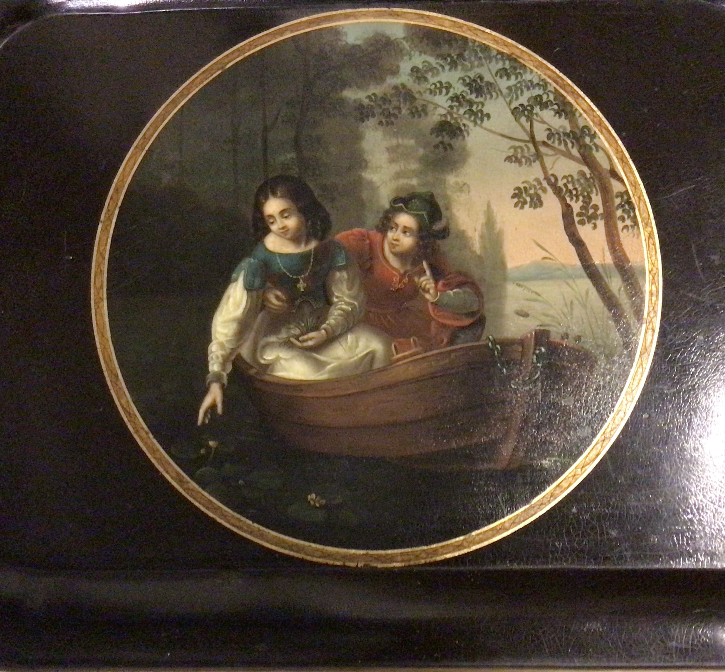 metalbakke med romantisk maleri er sortmalet med maleriet