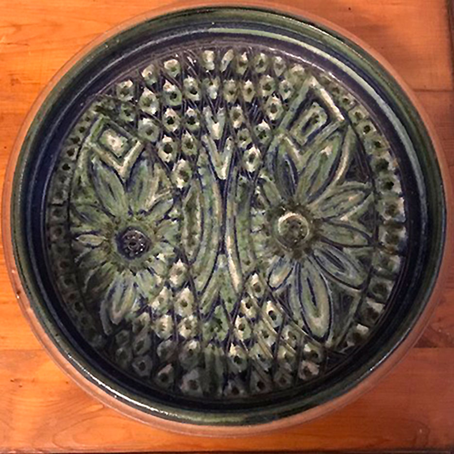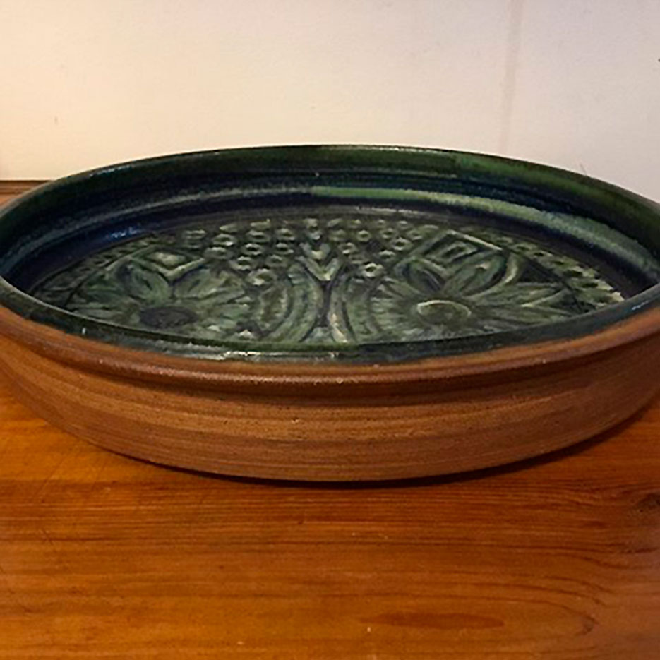 Stort Riisa Rundt fad i stentøj fra med smukglasur i blå