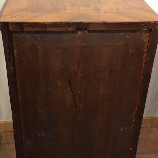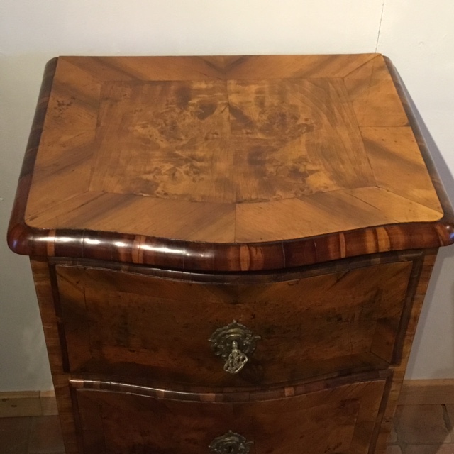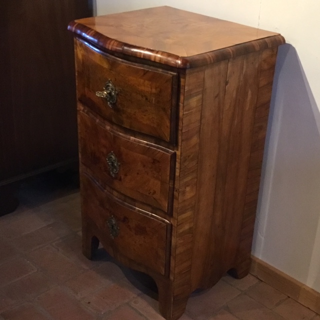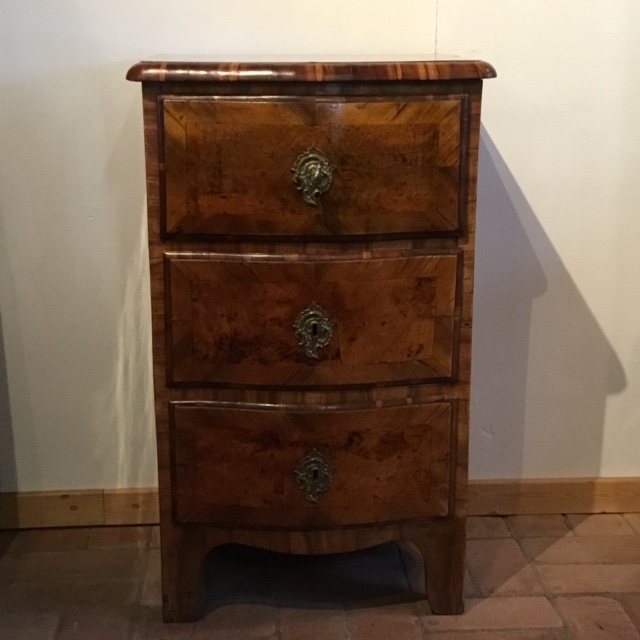 Elegant lille rokoko kommode i nøddetræ med tre skuffer. Original bagbeklædning,
