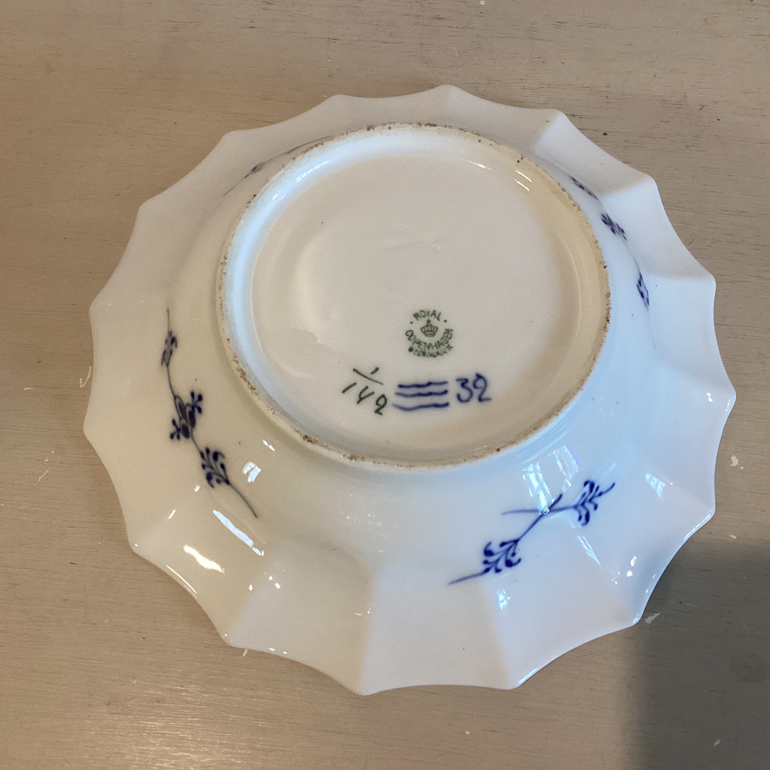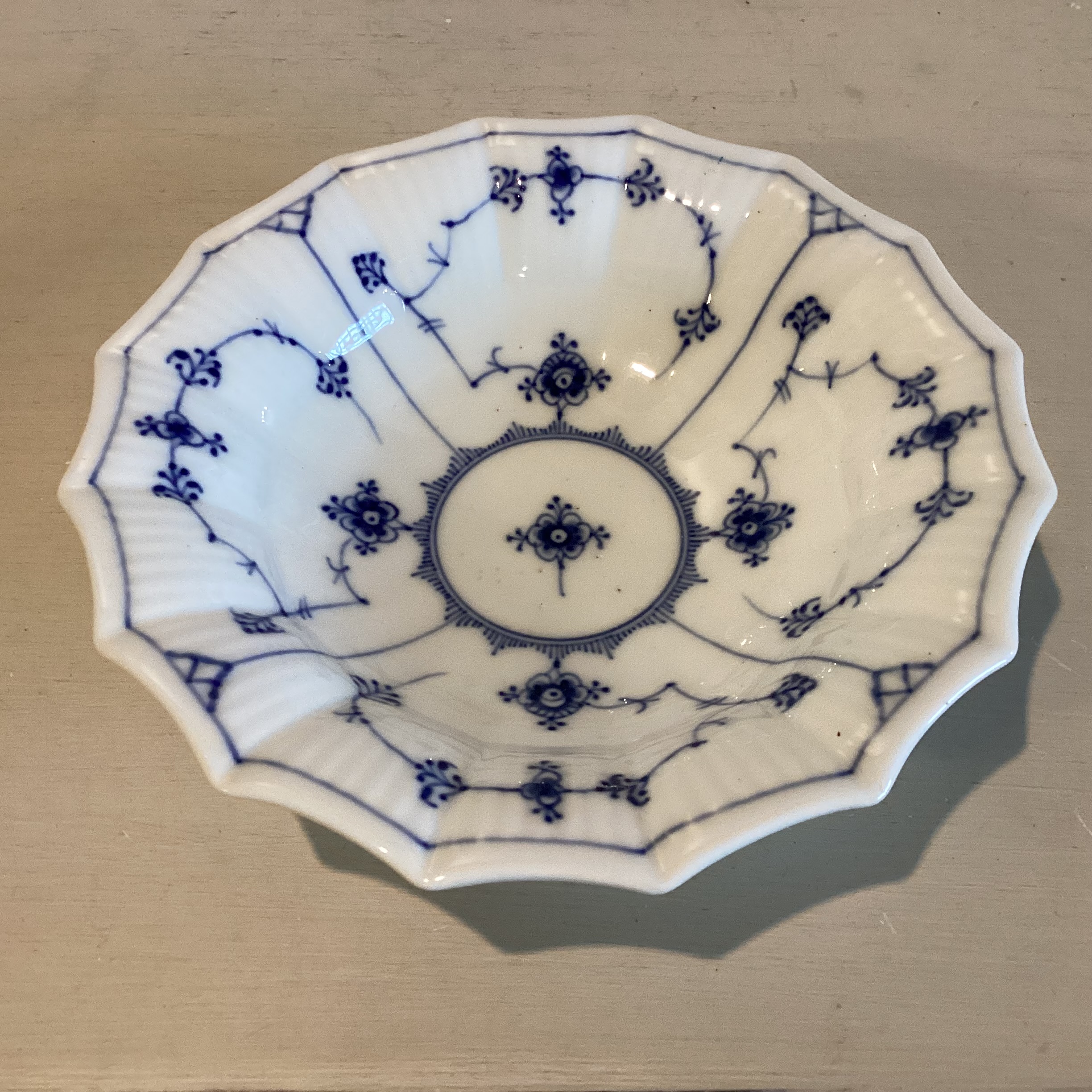 musselmalet kantet skål #1/142 i håndmalet riflet Kongeligt porcelæn.
