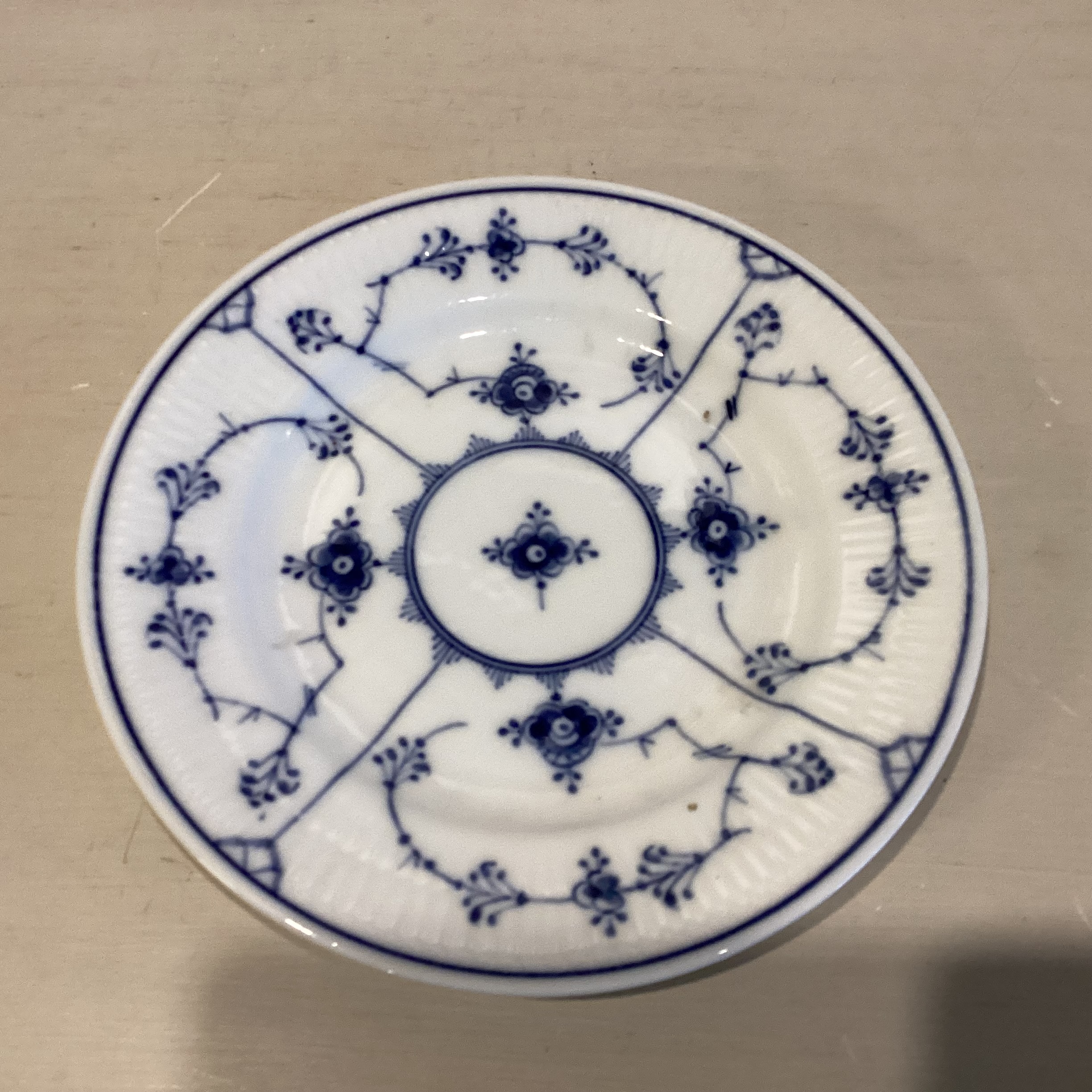Copenhagen musselmalet tallerken #180 i riflet håndmalet