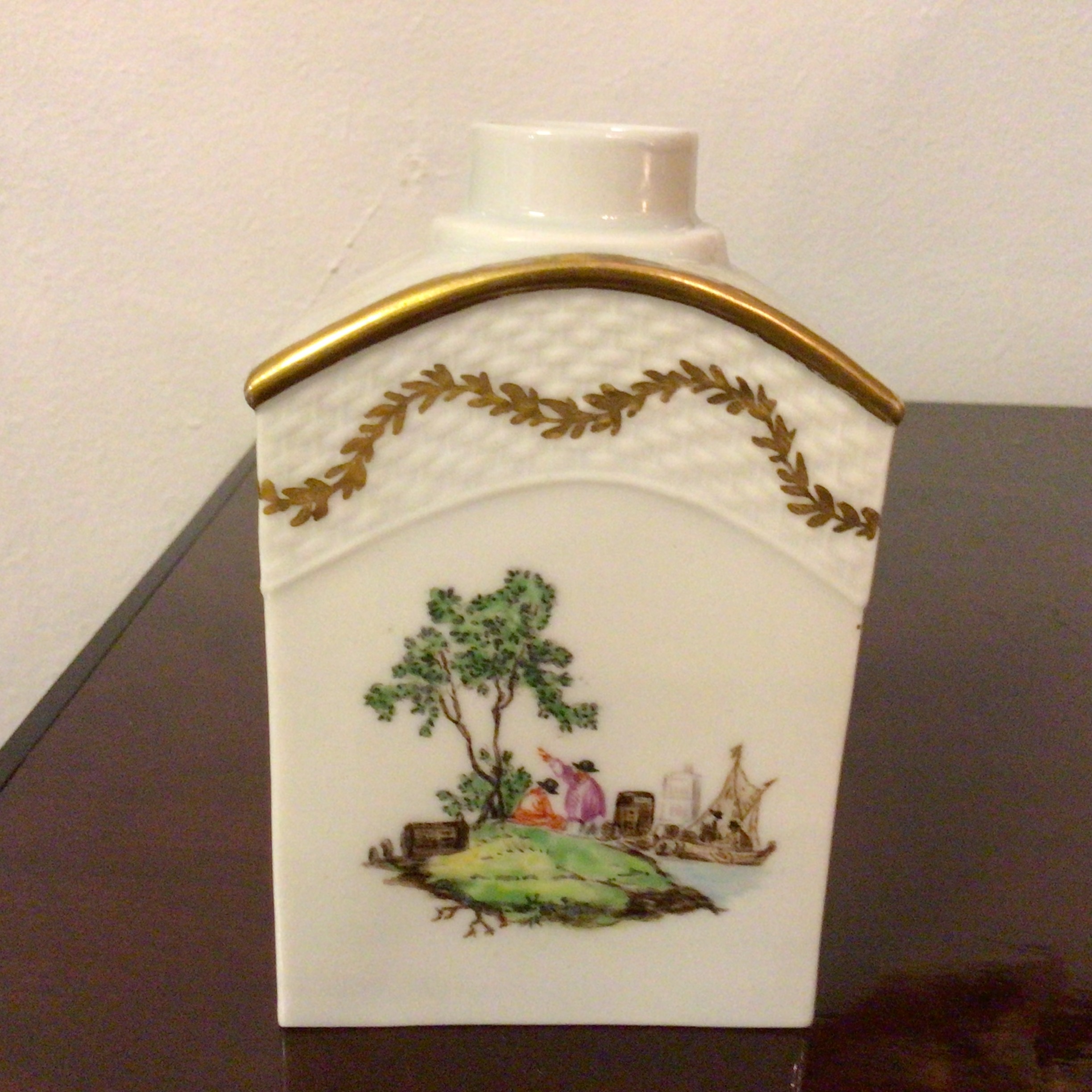 håndmalet porcelæn er prydet med personer i landskab, blomster