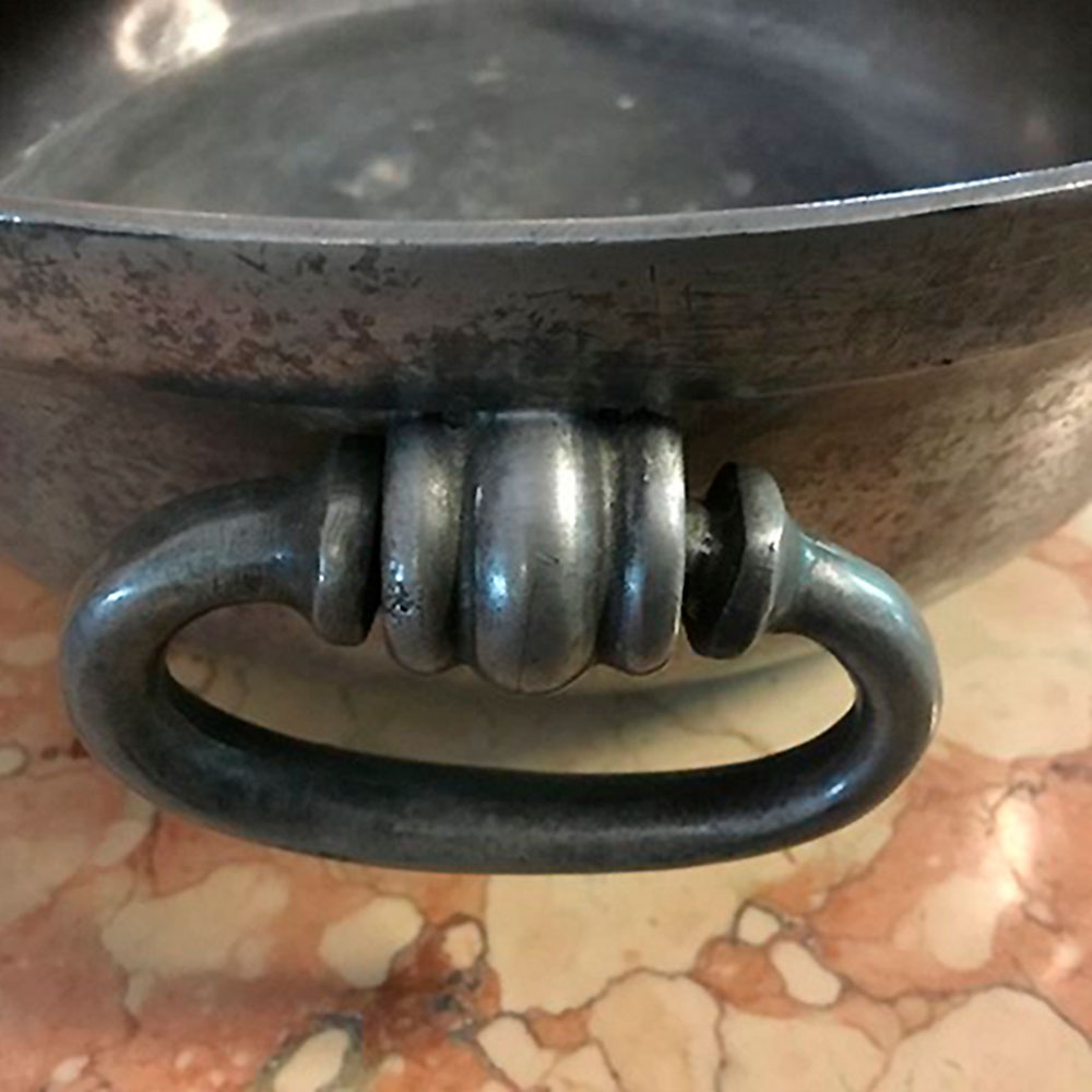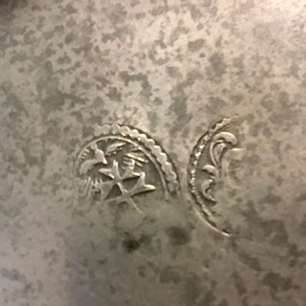 Smuk rund tinterrin med stempler i bunden. Flotte ørehanke