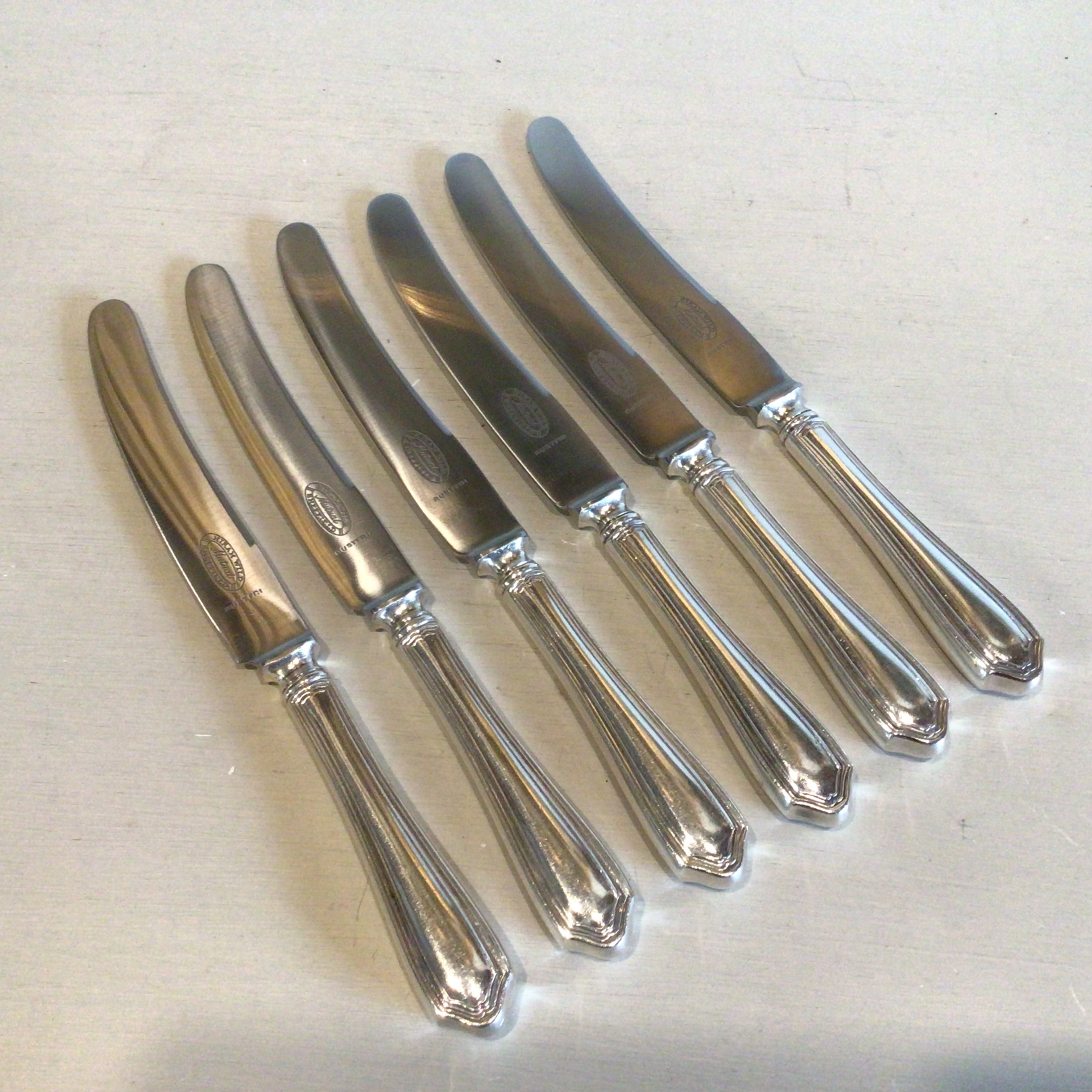 Seks engelske middagsknive i sølvplet. Knivbladet er