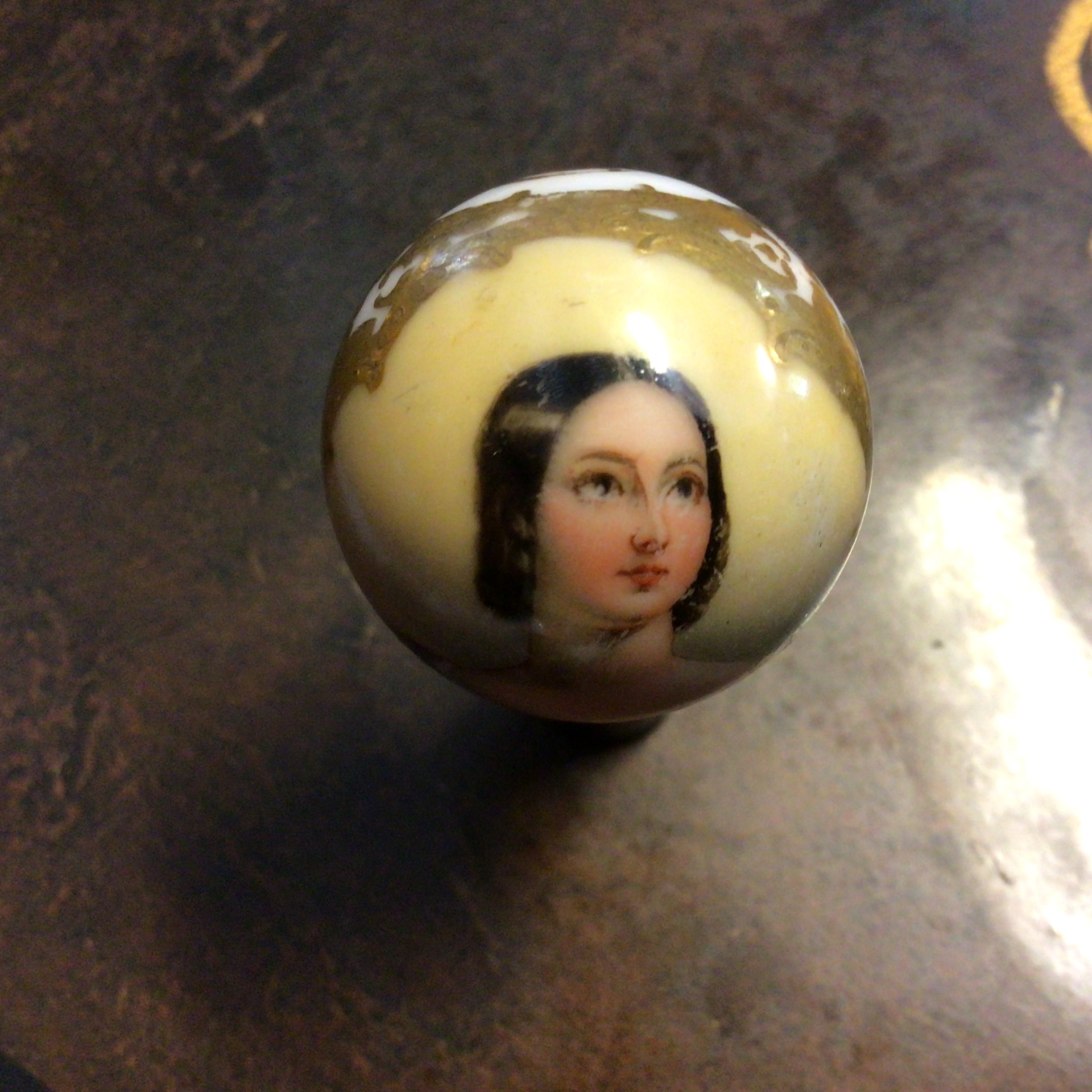 hoved i kugleformet porcelæn på guldsokkel har miniature maleri af
